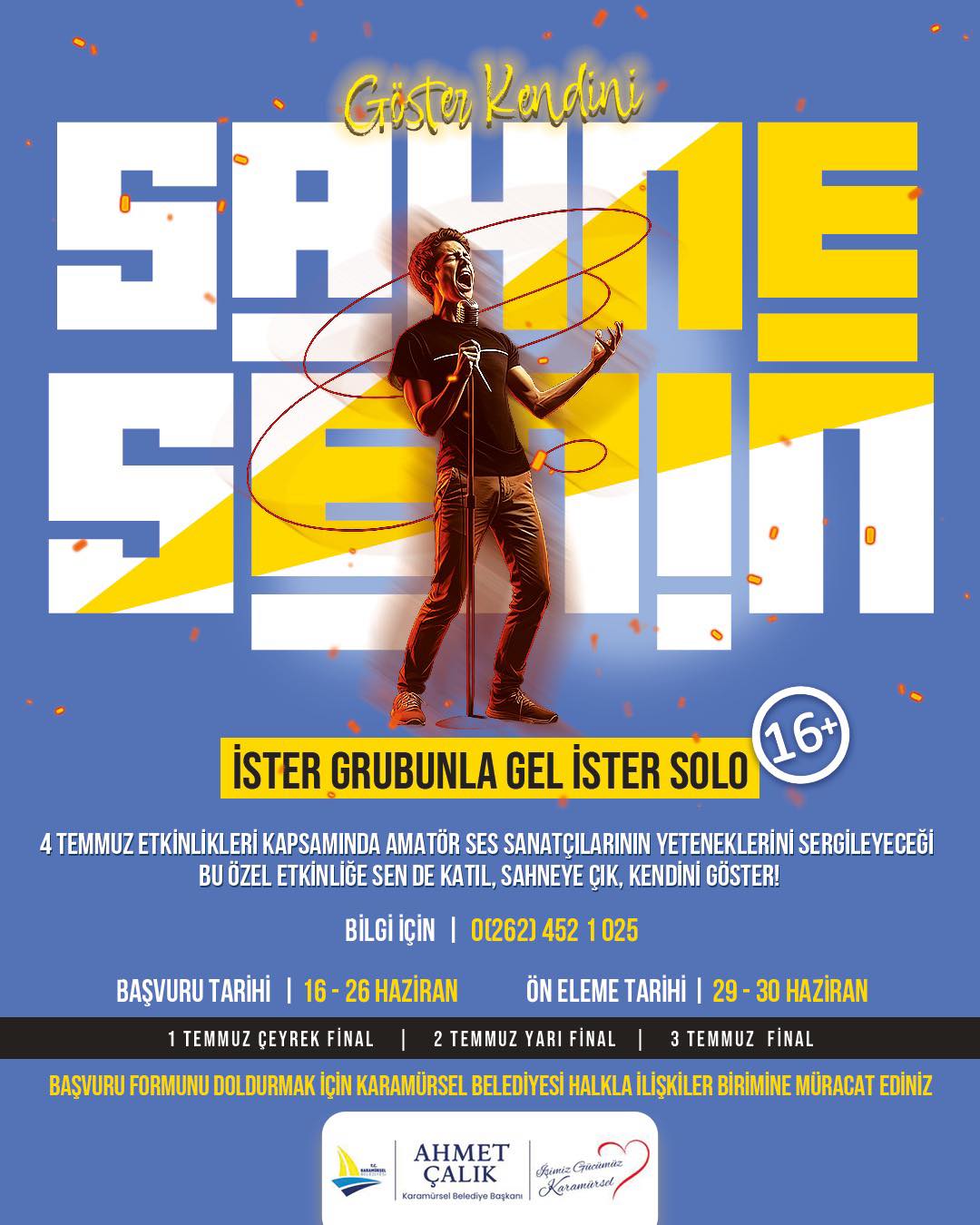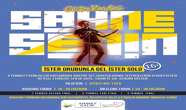 Karamürsel’in müzik tutkunları için dev bir sahne kuruluyor! “Sahne Senin” yarışmasıyla yetenekler gün yüzüne çıkacak, sesler şehri titretecek. Birbirinden değerli jüri üyelerinin değerlendireceği yarışma, katılımcıların müzik dolu bir serüvene adım atmasını sağlayacak.