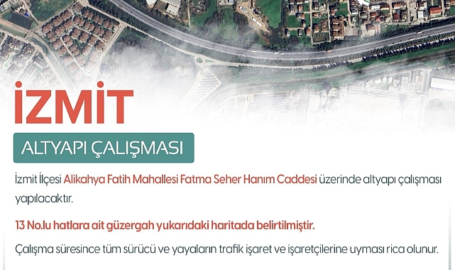 Kocaeli Büyükşehir Belediyesi, Alikahya tramvay hattı nedeniyle Fatma Seher Hanım Caddesinde çalışma yapacak. 44 gün sürecek çalışma nedeniyle bazı hatların güzergahlarında değişikliğe gidildi. 44 GÜNLÜK ÇALIŞMAİzmit Alikahya tramvay hattı yapım işi kapsamında Fatma Seher Hanım Caddesi üzerinde altyapı imalat çalışması nedeniyle trafik akışı otogar istikametine tek yöne çevrildi. Fatma Seher Hanım Caddesi üzerinden Alikahya yönüne gidecek olan vatandaşlar Albay Karaosmanoğlu Caddesi, Mustafa Kemal Bulvarı Ahmet Taner Kışlalı Caddesi güzergahını kullanacak. Alternatif Toplu Taşıma Güzergahları ise şu şekilde; - 13 No.lu hat Fatma Seher Hanım Caddesi yerine gidiş ve dönüş yönlerinde Sakıp Sabancı Bulvarını Kullanacak - 25-80 No.lu hat Kipa Avm Kalkışlı sefer Fatma Seher Hanım Caddesi yerine Albay Karaosmanoğlu Caddesi güzergahını kullanacak. - 29T No.lu hat Otogar Kalkışlı sefer Fatma Seher Hanım Caddesi yerine Albay Karaosmanoğlu Caddesi güzergahını kullanacak. - 28 No.lu hat Sekapark Kalkışlı sefer Fatma Seher Hanım Caddesi yerine Albay Karaosmanoğlu Caddesi güzergahını kullanacak. - 26 No.lu hat Yuvam Akarca kalkışlı sefer Fatma Seher Hanım Caddesi yerine Albay Karaosmanoğlu Caddesi güzergahını kullanacak.