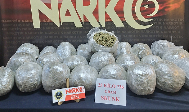 Batman İl Emniyet Müdürlüğünden yapılan açıklamada, Batman'a yüklü miktarda uyuşturucu madde sevkiyatı yapılacağı yönünde bilgi alındığı ve yapılan çalışmalar sonucu yakalanan araçta adli arama yapıldığı bildirildi.Yapılan aramada 25 kilogram 736 gram skunk uyuşturucu maddesi ele geçirildiği belirtilen açıklamada, olayla ilgili yakalanan 3 şüpheli şahsın "Uyuşturucu imal ve ticareti" suçu kapsamında sevk edildiği adli mercilerce tutuklanarak cezaevine teslim edildiği kaydedildi. (İLKHA)