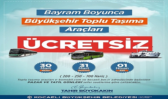 Büyükşehir Belediyesi, Ramazan Bayramı’nda vatandaşların ziyaretlerini rahat ve huzurlu bir şekilde gerçekleştirebilmeleri amacıyla 30 Mart-01 Nisan tarihleri arasında otobüs, raylı sistemler ve deniz ulaşımında ücretsiz hizmet verecek. BÜYÜKŞEHİR ZİYARETLERİ KOLAYLAŞTIRACAKKocaeli Büyükşehir Belediyesi, bayramın huzur ve mutluluğunu vatandaşlarla paylaşmak ve onların bayram ziyaretlerini daha da kolaylaştırmak için ücretsiz ulaşım desteği verecek. Bu kapsamda vatandaşlar, Ramazan Bayramı’nın birinci günü olan 30 Mart Pazar günü ile bayramın son gününe denk gelen 01 Nisan Salı günü 24.00’e kadar 3 gün boyunca ücretsiz ulaşımdan yararlanabilecek. TOPLU TAŞIMADA ULAŞIM ÜCRETSİZÜcretsiz ulaşım Ramazan Bayramı süresince deniz ulaşımı, belediye otobüsleri ve tramvay için geçerli olacak. Toplu taşıma araçları e-komobil ve kocaeli.bel.tr adreslerinde belirtilen pazar tatil sefer saatlerine göre çalışacak. BU HATLAR ÜCRETLİUlaşım Park’a ait Hat 200 İzmit-Kartal, Hat 250 Otogar-Sabiha Gökçen Havalimanı ve Hat 700 hatları ise ücretli bir şekilde hizmet vermeye devam edecek.