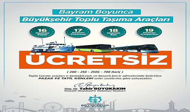 Kocaeli Büyükşehir Belediyesi, Kurban Bayramı süresince vatandaşların ulaşımlarını sorunsuz bir şekilde sağlamak amacıyla ücretsiz ulaşım hizmeti verecek. Bu kapsamda vatandaşlar Kurban Bayramı’nın birinci günü olan 16 Haziran Pazar günü ile 19 Haziran Çarşamba gününe kadar 4 gün boyunca ücretsiz ulaşımdan yararlanabilecek. ÜCRETSİZ HATLARÜcretsiz ulaşım Kurban Bayramı süresince deniz ulaşımı, belediye otobüsleri ve tramvay için geçerli olacak. Toplu taşıma araçları, Eko-mobil ve kocaeli.bel.tr adreslerinde belirtilen pazar tatil sefer saatlerine göre çalışacak. ÜCRETLİ HATLAR Ulaşım Park’a ait Hat 200, Hat 250, Hat 250G ve Hat 700 ise ücretli bir şekilde hizmet vermeye devam edecek.