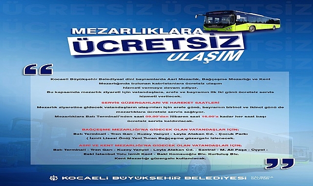 Kocaeli Büyükşehir Belediyesi dini bayramlarda Asri Mezarlık, Bağçeşme Mezarlığı ve Kent Mezarlığı’nda bulunan kabristanlara ücretsiz ulaşım hizmeti vermeye devam ediyor. Bu kapsamda Mezarlık ziyareti için vatandaşlara Kurban Bayramının arifesi olan 15 Haziran Cumartesi ile bayramın ilk iki günü ücretsiz servis hizmeti verilecek. SAAT BAŞI ARAÇMezarlık ziyaretine gidecek vatandaşların ulaşımları için arife günü, bayramın birinci ve ikinci günü de mezarlıklara ücretsiz servis sağlanıyor. Mezarlıklara Batı Terminali’nden sabah saat 09.00’dan itibaren saat 16.00’ya kadar her saat başı ücretsiz servis kaldırılacak. SERVİS GÜZERGÂHLARIBatı Terminali’nden kalkacak olan servislerBağçeşme Mezarlığı’na gidecek olan vatandaşlar için;Batı Terminali-Tren Garı-Kuzey Yanyol-Leyla Atakan Caddesi- Çocuk Parkı (İzmit Lisesi Önü)-Yeni Turan ve Bağçeşme güzergahını izleyecek. Asri ve Kent Mezarlığı’na gidecek olan vatandaşlar için;Batı Terminali-Tren Garı-Kuzey Yanyol-Leyla Atakan Caddesi Santral-M. Ali Paşa-Üçyol-Eski İstanbul Yolu İzmit Kent - Baki Komsuoğlu Blv.- Kurtuluş Bulvarı - Kent Mezarlığı güzergâhı kullanılacak.