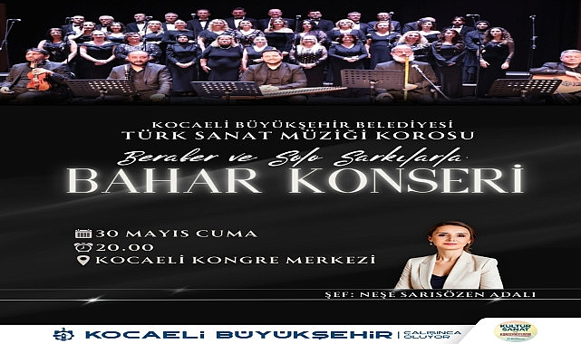 Kocaeli haberleri">Kocaeli Büyükşehir Belediyesi’nin kentin gözde koroları arasında yer alan Türk Sanat Müziği Korosu, “Beraber ve Solo Şarkılarla Bahar Konseri” 30 Mayıs Cuma akşamı (yarın) Kocaeli Kongre Merkezi’nde saat 20.00’de gerçekleştirilecek. Şef Neşe Sarısözen Adalı yönetimindeki koro, konserde Türk Sanat Müziği’nin en güzel eserlerini seslendirecek. Solo performanslara da yer verilecek olan konser ücretsiz ve tüm vatandaşların katılımına açık olacak.