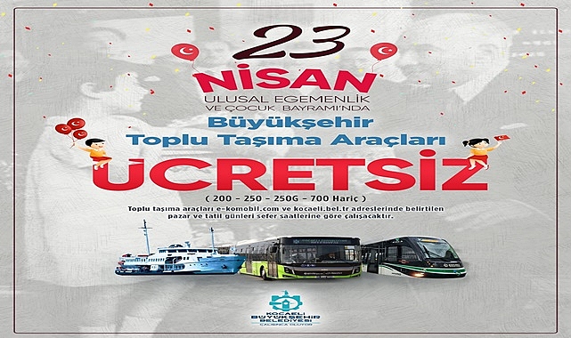 Kocaeli Büyükşehir Belediyesi 23 Nisan Ulusal Egemenlik ve Çocuk Bayramında ulaşımda ücretsiz hizmet verecek. ÜCRETSİZ ULAŞIM23 Nisan Ulusal Egemenlik ve Çocuk Bayramı’nda belediyeye ait toplu ulaşım araçlarında ücretsiz yolcu taşıma kararı aldı. 23 Nisan Salı günü belediyenin otobüsleri, tramvay ve deniz ulaşımında vatandaşların kutlamalara rahat ulaşım sağlamaları ve bayramı coşkuyla kutlamaları için ücretsiz hizmet verecek.BU HATLAR ÜCRETLİBüyükşehir Belediyesince yapılan açıklamada 200, 250, 250G ve 700 nolu hatlarda ise binişler ücretli olarak devam edecek
