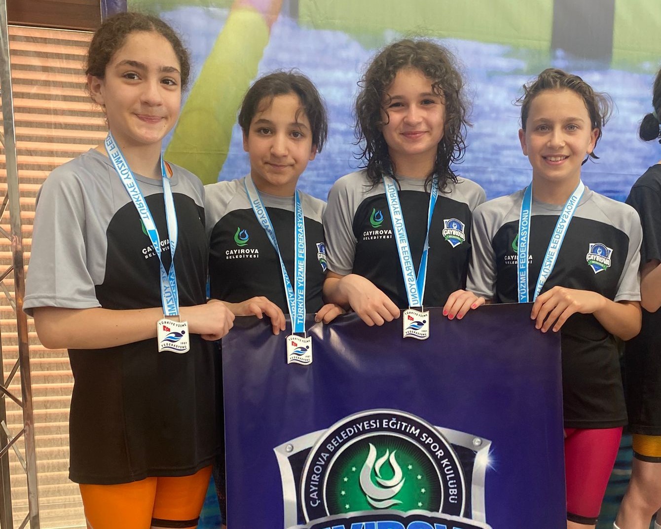 İlçede hayata geçirdiği projeler ve yaptığı çalışmalarla Çayırova’yı spor kenti kimliği kazandıran Çayırova Belediye Başkanı Bünyamin Çiftçi’nin gayretleri meyvelerini vermeye devam ediyor. Çayırova Belediyesi Eğitim Spor Kulübü’nün yüzme sporcuları 9-11 Mayıs tarihleri arasında Rize’de düzenlenen Türkiye Yüzme Federayonu 10-11-12 Yaş Ulusal Gelişim Ligi 1. Etap Yüzme Müsabakalarında, başarılarıyla göz doldurdu. Çayırova Belediyesi’nin minik yüzücüleri, müsabakalarda toplamda 354 madalya alarak büyük bir başarı elde etti. Ayrıca Çayırova Belediyesi Eğitim Spor Kulübü’nün minik yüzücüsü Yağmur Yeyin, 50 kelebek ve 100 kelebek stilde Türkiye Şampiyonu olma başarısını gösterdi ve Çayırova’ya büyük bir gurur yaşattı. BİRÇOK DERECE ELDE ETTİÇayırova Belediyesi Eğitim Spor Kulübü Yüzücüsü Yağmur Yeyin, Türkiye şampiyonluklarının yanı sıra, 50 kelebek, 50 serbest, 100 kelebek ve 200 karışık stilde 4 bölge birinciliği aldı. Hesna Zeren Turali 20 karışık stilde bölge üçüncüsü olurken, Derin Dilber Aktaşi 50 kurbağa, 50 kelebek ve 200 kurbağa yarışlarında bölge ikincisi oldu. Takım yarışlarında ise, 4*50 serbest bayrak 11 yaş kızlar yarışında bölge birinciliği, 4*50 karışık bayrak 11 yaş kızlar yarışında bölge ikinciliği, 4*100 metre serbest bayrak 11 yaş kızlar bölge ikinciliği ve 4*100 metre karışık bayrak 11 yaş kızlar bölge ikinciliği elde etti. “YÜREKTEN KUTLUYORUM”Konu hakkında açıklamalarda bulunan Çayırova Belediye Başkanı Bünyamin Çiftçi, şunları dile getirdi; “Yüzmede Türkiye şampiyonluğu. Türkiye Yüzme Federasyonu tarafından Rize’de düzenlenen 10-11-12 yaş Ulusal Gelişim Ligi 1. Etap müsabakalarına 15 kişilik ekiple katılarak toplamda 35 madalya kazanan Çayırova Belediyesi Eğitim Spor Kulübü sporcularımızı ve 50 ile 100 metre kelebek stilinde Türkiye Şampiyonu olan Yağmur Yeyin’i yürekten kutluyor, başarılar diliyorum.”
