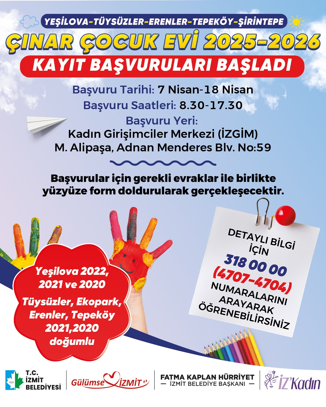 İzmit Belediyesi Kadın ve Aile Hizmetleri Müdürlüğü, 2025-2026 Eğitim Öğretim dönemi için Çınar Çocuk Evleri’nde yeni dönem kayıtlarını başlattı. Kayıtlar 7 Nisan - 18 Nisan tarihleri arasında alınacak. Başvurular, İZGİM Kadın Girişimciler Merkezi’nde yapılacak. Başvuru saatleri ise 08:30-17:30 arasında olacak. Başvurular, gerekli evraklarla birlikte yüz yüze form doldurularak gerçekleştirilecek. KAYIT İÇİN GEREKLİ EVRAKLAR:Sağlık raporuÇocuğun ve velinin kimlik fotokopileriNüfus kayıt örneği (hanede yaşayan herkesin görünecek şekilde)Hanede çalışan herkesin ek ödemeli maaş bordrosuÇalışmayan 18 yaş üstü bireylerden E-Devlet’ten alınacak güncel SGK dökümüBoşanmış ebeveynler için vasi kararı veya velayet belgesi, boşanma süreci devam ediyorsa mahkeme kararının fotokopisiŞehit ve gazi yakınları için ilgili belgeler ÇINAR ÇOCUK EVLERİ VE YAŞ GRUPLARI:Yeşilova Çınar Çocuk Evi: 2022, 2021, 2020 doğumlularTüysüzler Canan Dağdeviren Çınar Çocuk Evi, Ekopark Havva Kolaylı Çınar Çocuk Evi, Erenler İsmail Hakkı Toker Çınar Çocuk Evi, Tepeköy Şehit Polis Şeyda Yılmaz Çınar Çocuk Evi: 2021 ve 2020 doğumlular Önemli Uyarı: Başvurular sırasında eksik evrak teslimi durumunda başvurular geçersiz sayılacaktır. Ayrıca, yalnızca bir okul için başvuru yapılabilir. Aynı haneden iki çocuk başvurusu yapacak aileler, her bir öğrenci için ayrı başvuru yapmalıdır.Detaylı bilgi ve başvuru için 318 0000 – Dahili 4707-4704 numaralı telefona ulaşılabilir.