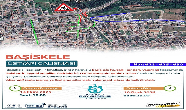 D-130 BAĞLANTI YOLLARI ÜZERİNDE ÇALIŞMAKocaeli Büyükşehir Belediyesi, D-130 Karayolu üzerinde yapımı süren “Başiskele Kavşağı Koridoru Projesi” kapsamında önemli bir trafik düzenlemesi yapıyor. Proje çalışmaları çerçevesinde, Selahattin Eyyubi Caddesi ve Millet Caddesi’nin D-130 Karayolu’na bağlantı yolları üzerinde imalat çalışmaları başlatılacak. Bu nedenle söz konusu bağlantı yolları geçici süreyle araç trafiğine kapatıldı. ALTERNATİF GÜZERGÂHLAR14 Ekim Salı günü (bugün) saat 10.00’dan itibaren başlayan yol kapanışının, 10 Ocak 2026 Cumartesi günü saat 23.00’e kadar sürmesi planlanıyor. Bu süre zarfında özel araç ve toplu taşıma kullanıcıları, herhangi bir aksaklık yaşamamaları için Atatürk Caddesi, Millet Caddesi ve Yürüyüş Caddesi güzergâhına yönlendirilecek. Ayrıca çalışma süresince trafik işaret ve levhalarına dikkat edilmesi önemle vurgulanıyor.