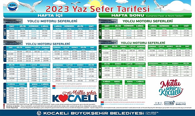 Kocaeli Büyükşehir Belediyesi Ulaşım Dairesi Başkanlığı’na bağlı Deniz Ulaşım Müdürlüğü, Yolcu vapuru seferlerinde yaz sefer uygulamasına geçiyor. Buna göre Yaz sefer uygulaması 03 Temmuz Pazartesi günü başlayacak.
