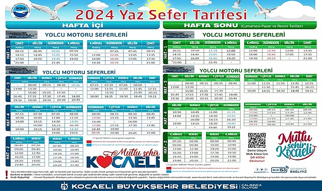 Kocaeli Büyükşehir Belediyesi Ulaşım Dairesi Başkanlığı’na bağlı Deniz Ulaşım Şube Müdürlüğü tarafından uygulanan yolcu vapuru seferlerinde yaz sefer uygulamasına geçiyor. Buna göre yaz sefer uygulaması 24 Haziran Pazartesi günü başlayacak.4 HAT 90 SEFERKocaeli Büyükşehir Belediyesi ulaşımda vatandaşları rahatlatacak uygulamalarına devam ediyor. Bu kapsamda, 4 hatta 90 seferle 8 yolcu iskelesinde hizmet verilmekte olan yolcu vapuru seferlerinde 24 Haziran Pazartesi günü itibariyle yaz sefer tarifesi uygulamasına geçilecek.SEFERLER E-KOMOBİL’DEOkulların kapanması ve çalışma saatleri göz önünde bulundurulan yaz sefer tarifesine Kocaeli Büyükşehir Belediyesi İnternet sitesi ve E-komobil uygulamasından ulaşılabiliyor.