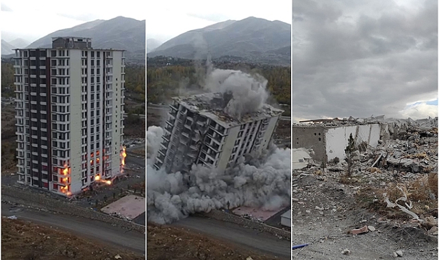 6 Şubat Kahramanmaraş merkezli depremlerde büyük yıkımın yaşandığı Malatya’da ağır hasarlı binaların yıkımı sürüyor. Çevreye tehlike arz etmeyecek yüksek katlı binalar patlayıcı, diğer yapılar ise iş makinaları ile yıkılıyor.36 bin ağır hasarlı binanın bulunduğu kentte şimdiye kadar 10 bin üzeri binanın yıkım işleri tamamlanırken, diğer binalar ise yıkım için gün sayıyor.Yeşilyurt ilçesine bağlı Yakınca Mahallesi'nde bulunan 16 katlı bir bina da depremde ağır hasar alması nedeniyle bugün dinamitle patlatıldı.Alınan çevre güvenliğinin ardından binaya yerleştirilen bin 200 kapsülden oluşan 120 kilogram dinamit, geri sayım yapılmasının ardından patlatıldı. Patlatma ile birlikte bina saniyeler içerisinde yerle bir oldu. (İLKHA)