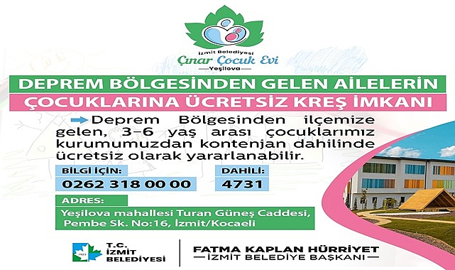 İzmit Belediyesi, deprem bölgesinden gelen çocuklara Yeşilova Çınar Çocuk Evi’nde ücretsiz eğitim verecek. İzmit’e gelen 3-6 yaş arasındaki çocuklar, Çınar Çocuk Evi’nden kontenjan dahilinde ücretsiz olarak yararlanabilecek. Hizmetten yararlanmak isteyenler aileler, 0262 318 00 00 – dahili 47 31 numaralı telefondan bilgi alabilecek.