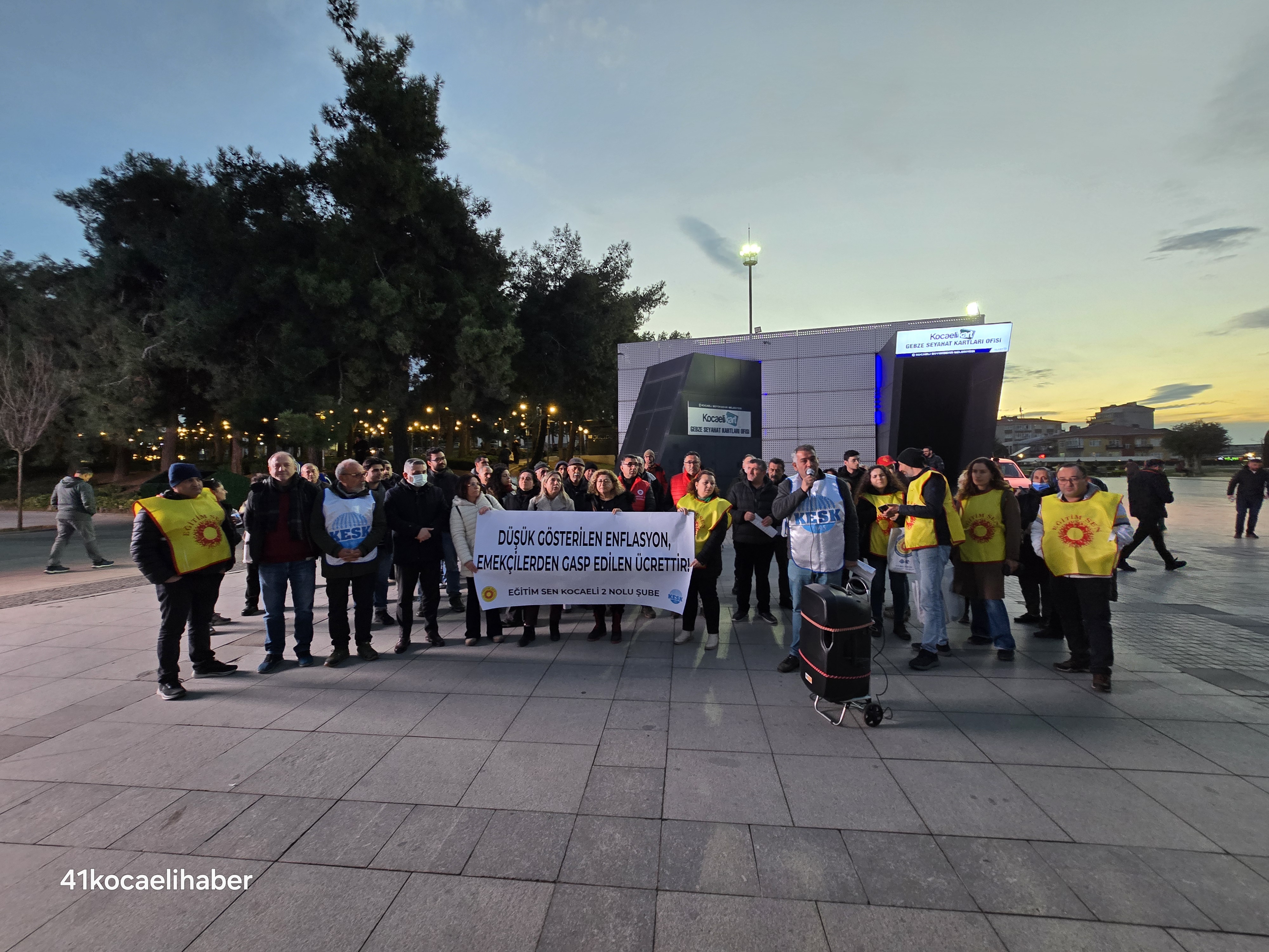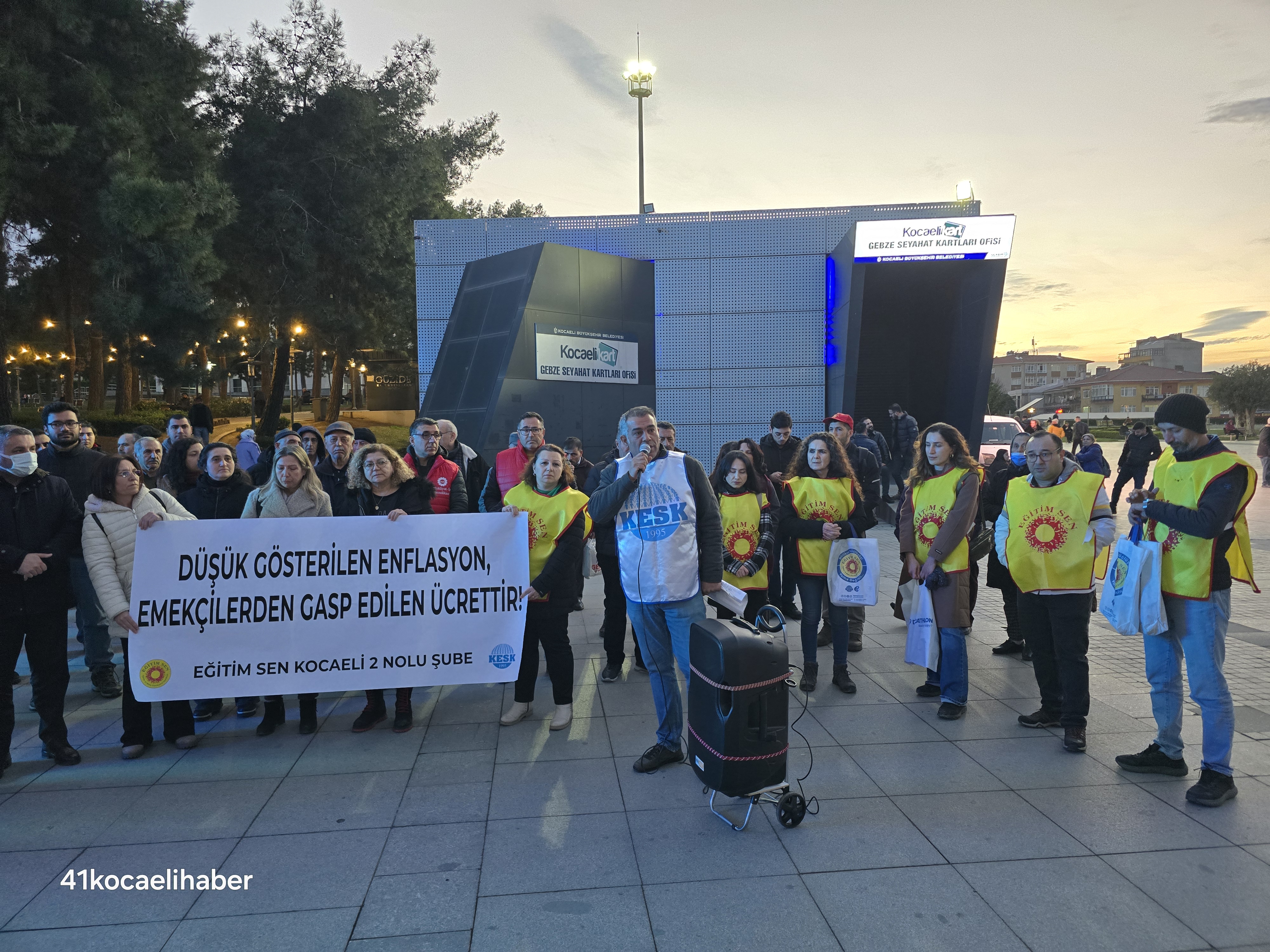 Eğitim-Sen Kocaeli 2Nolu Şubesi’ne üye öğretmenler ve STK temsilcileri memur maaşlarına yapılan zamla ilgili olarak Gebze Kent Meydanı’nda basın açıklaması gerçekleştirdiler. Basın açıklamasını Eğitim-Sen Kocaeli 2Nolu Şube Başkanı Sinan Kaya yaparak, ''Gözümüzü iğneden ipliğe her şeye yapılan zam fırtınası ile açtığımız, bir yılı, 2025 yılını geride bıraktık. Yıllardır devam eden yoksullaştırma politikalarından 4 Milyon kamu emekçisi ve 2,5 milyon kamu emeklisi olarak bizler de payımıza düşeni aldık.