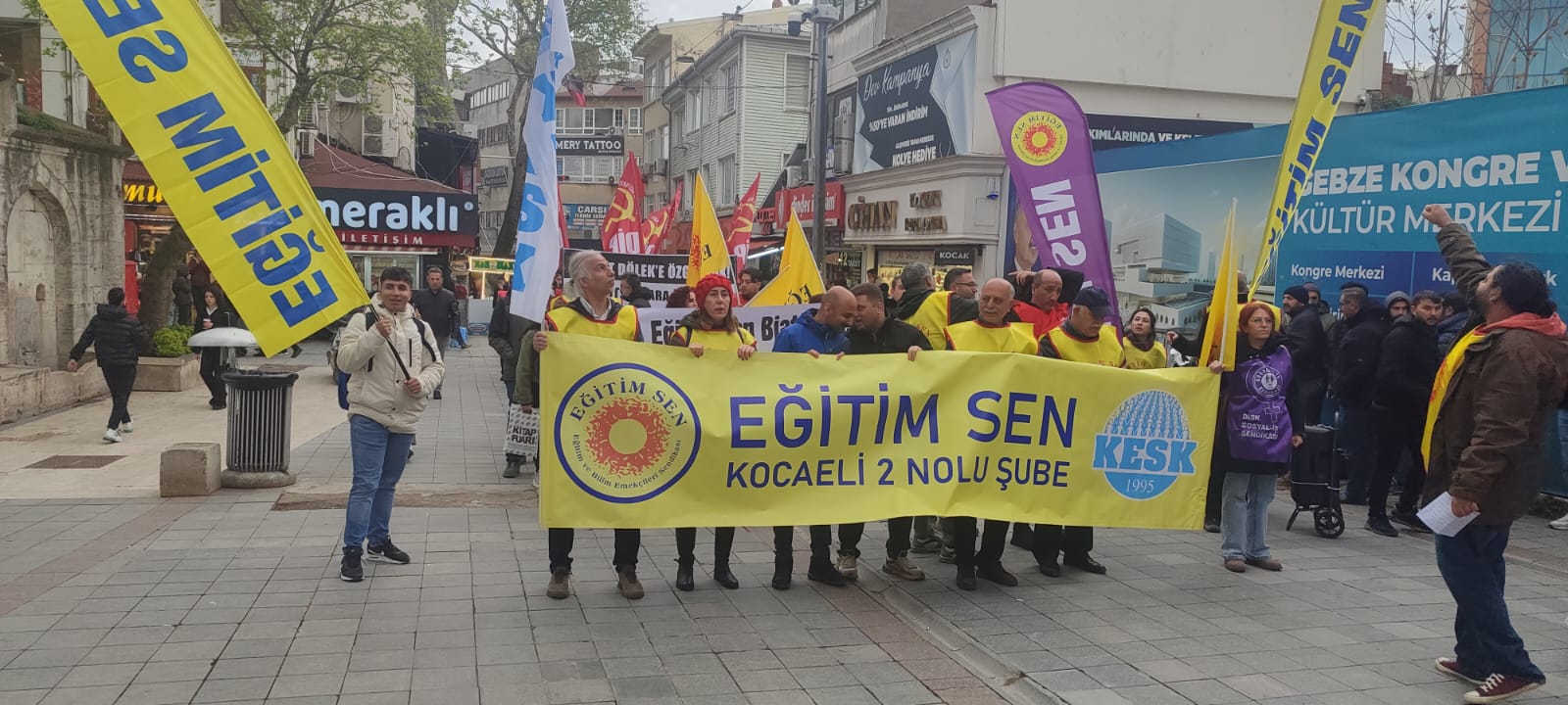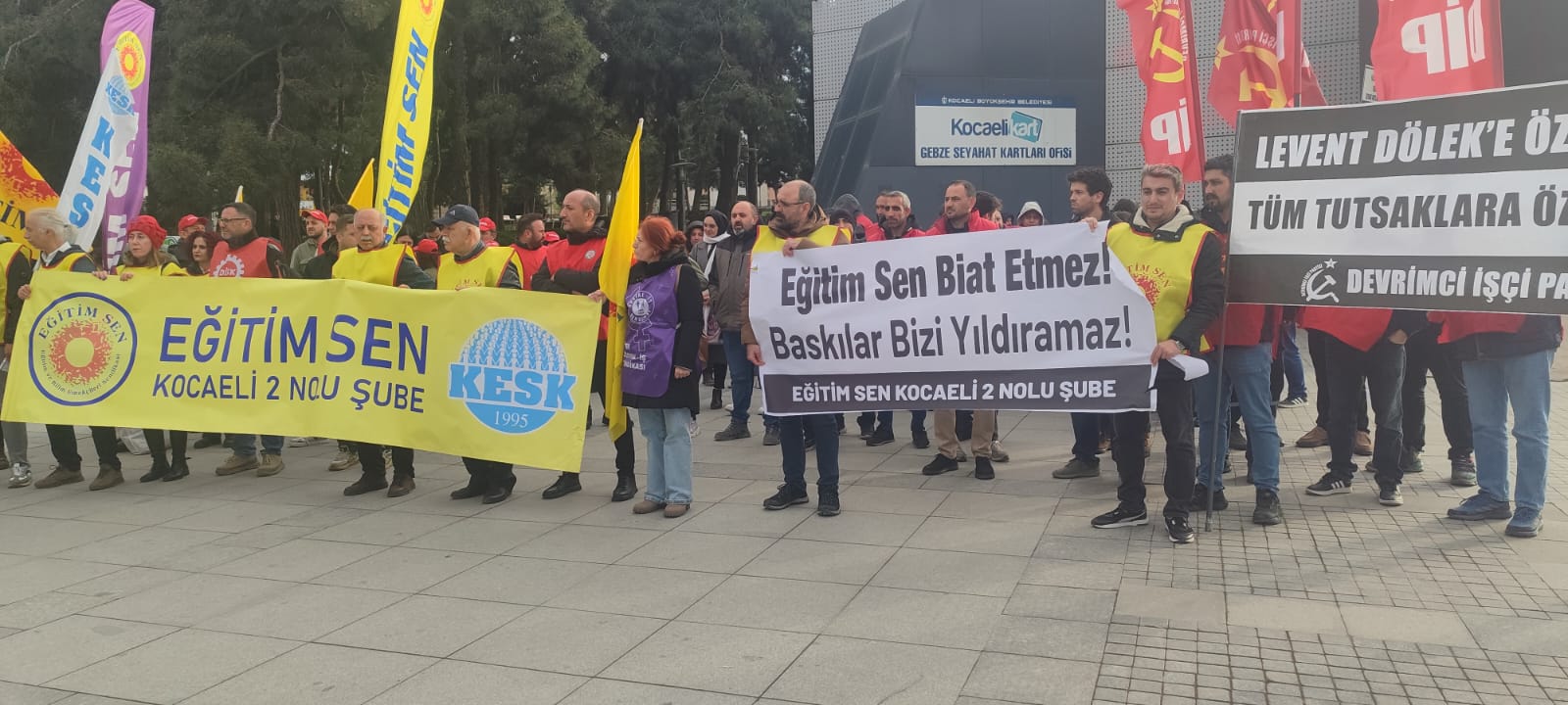Eğitim-Sen Kocaeli 2 Nolu Şubesi dün akşam basın açıklaması ve yürüyüş gerçekleştirdiler. Gebze Tarihi Eskiçarşı Çeşme önünde toplanan öğretmenler Sloganlar eşliğinde Gebze Kent Meydanı’na yürüyüş yaparak basın açıklaması gerçekleştirdiler. Gebze'de gerçekleştirilen basın açıklamasına, birçok sendika ve siyasi grup da destek verdi. Eğitim-Sen Kocaeli 2 Nolu Şubesi Başkanı Sinan Kaya yaptığı basın açıklamasında, ''Bugün burada Eğitimsen Merkez Yürütme Kurulu üyelerine verilen 2 haftalık ev hapsi ve sonrası için yurtdışı yasağı ve adli kontrol cezasını, Eğitimsen Üyeleri ve İstanbul Üniversitesi İktisat Fakültesi İktisat Tarihi ABD Öğretim Üyesi Dr. Levent Dölek, Mehmet Türkmen ve tutsak edilen tüm hak savunucuları, üye ve öğrencilerimizin serbest bırakılması için bir araya geldik. Peki ne olmuştu: