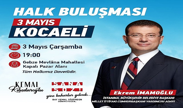 Millet İttifakı Cumhurbaşkanı Yardımcısı adayı ve İstanbul Büyükşehir Belediye Başkanı Ekrem İmamoğlu, Türkiye’nin dört bir yanında sürdürdüğü Halk Buluşması Mitingleri’nin Kocaeli durağı için 3 Mayıs Çarşamba Günü saat 19.00’da Gebze Mevlana Mahallesi Kapalı Pazar Alanı’nda Kocaelililer ile buluşacak. 28 Nisan’da Millet İttifakı Cumhurbaşkanı adayı Kemal Kılıçdaroğlu, İYİ Parti Genel Başkanı Meral Akşener, Cumhurbaşkanı Yardımcısı adayı Ankara Büyükşehir Belediye Başkanı Mansur Yavaş ile Kocaelilileri buluşturan CHP Kocaeli İl Örgütü, bu kez batı yakasında İmamoğlu ile Sana Söz diyerek 14 Mayıs’a hazırlanacak.