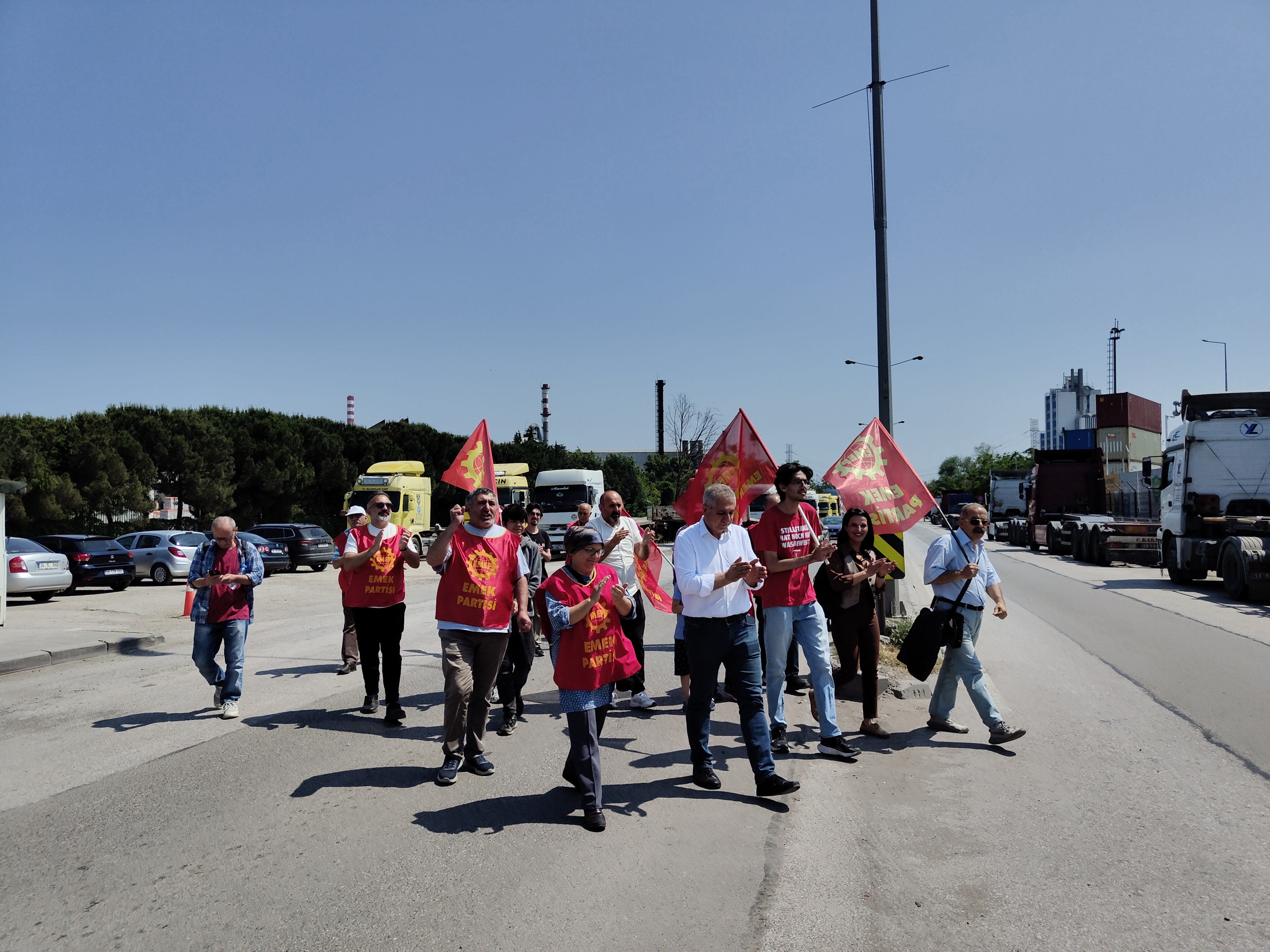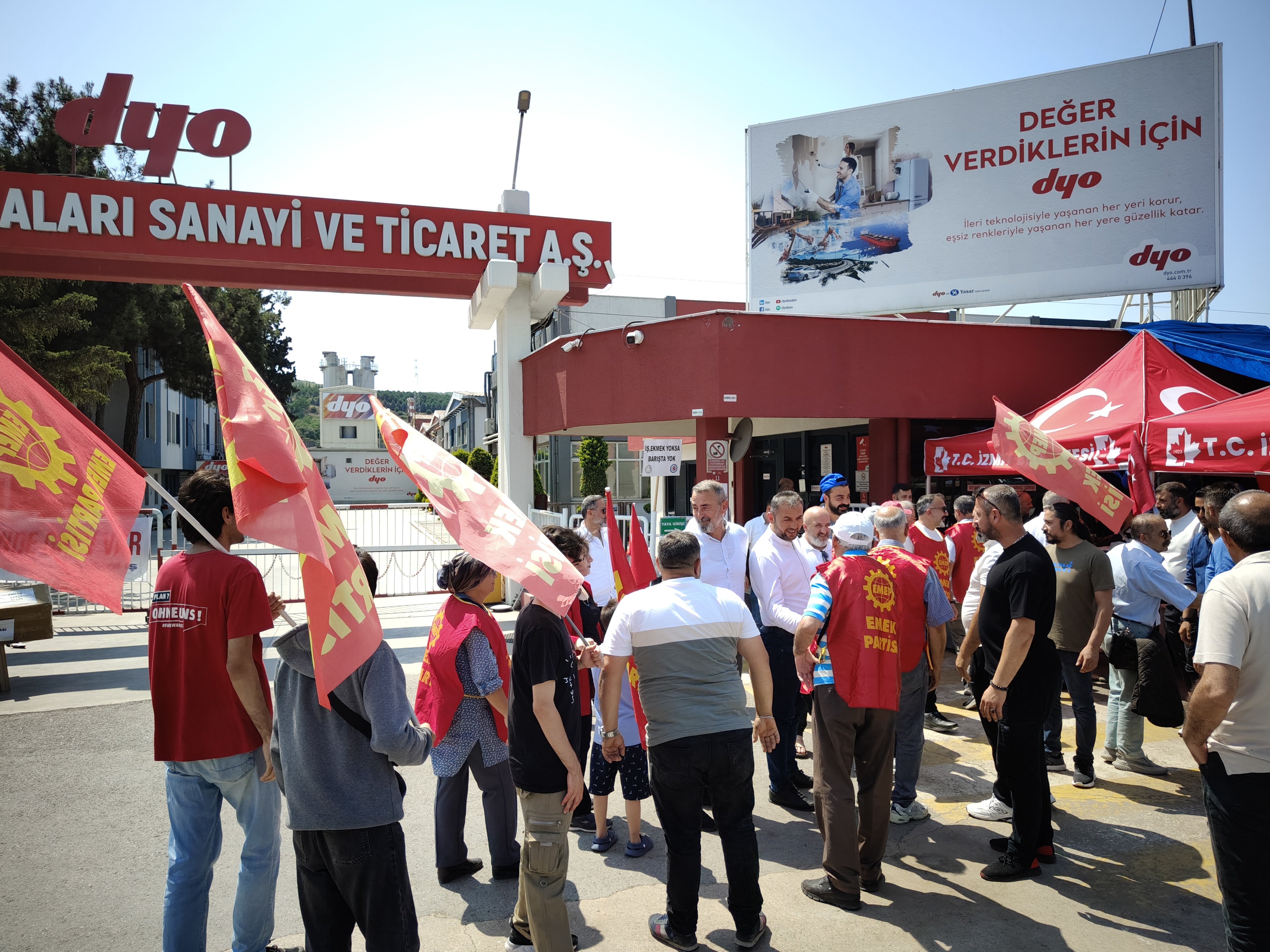 Kocaeli Dilovası'nda kurulu bulunan Petrol-İş üyesi DYO Boya'da işçiler 18 gündür grevde. Grevi ziyaret eden Emek Partisi Genel Başkanı Seyit Aslan, "Türkiye işçi sınıfının bir parçası olan DYO işçilerinin bu mücadelesi, grevi hepimizin ortak mücadelesidir" dedi. '18 gündür desteklerini esirgemediler' "DYO işçisi kazanacak", "İş ekmek özgürlük" ve "Yaşasın sınıf dayanışması" sloganlarının atıldığı ziyarette konuşan Petrol-İş Gebze Şube Sekreteri Dursun Karataş, "Emek Partisi grevimizde 18 gündür desteklerini esirgemedi. Bugün de aramızda yine Emek Partisi Genel Başkanı Seyit Aslan, Genel Başkan Yardımcısı Arzu Erkan, il ve ilçe üye ve yöneticileri grevimizi ziyaret etti. Kendilerine DYO Boya çalışanları ve Petrol-İş Gebze Şubesi olarak teşekkür ediyoruz" diye konuştu. 'En güzel renginiz alınteriniz' "Türkiye işçi sınıfının bir parçası olan DYO işçilerinin bu mücadelesi, grevi hepimizin ortak mücadelesidir" diyen Emek Partisi Genel Başkanı Seyit Aslan, "Sloganınızda ifade ettiğiniz gibi 'En güzel rengimiz alınterimiz' sözü tam anlamını bulmuş. Toplu iş sözleşmesi masalarına oturduğumuzda bize ilk söylenen, 'Bu şirketler kazanmıyor, zarar ediyoruz' oluyor. Ama bu şirketlere bakıyoruz yılların şirketleri her yıl karlarına kar katıyorlar. Bir fabrikaları var beş olmuş, beş fabrikaları var on olmuş. Ama söz konusu işçi arkadaşlarımızın ücretlerine gelince olabildiğince en az ücretlere ve en ağır koşullarda çalıştırmayı, insanlık dışı muameleyi bize reva görüyorlar" dedi. 'Burada sürdürülen Grev bir onur ve haysiyet mücadelesi'DYO Boya işçisinin onur ve haysiyet mücadelesi verdiğini vurgulayan Aslan, "Tabi ki ekonomik kazanımlarımız olacak, daha insanca bir ücret alacağız ama bugün Türkiye’deki sermayenin, kapitalistlerin işçi sınıfına dönük saldırısı ve her türlü muameleyi reva gören tutumuna karşı onur ve haysiyet meselesini de beraberinde getiriyor. Milyonlarca işçi ve emekçinin yaşamış olduğu sorunlar ancak ve ancak kitlesel olarak birleşik bir mücadelenin sonucunda çözülebilir. Ülkede genel grev ve genel direnişlerini tartıştığımız bir dönemdeyiz. Eğitimden sağlığa, insanca yaşayacak bir ücretten ulaşılabilir bir konuta kadar işçi sınıfının itilmiş olduğu o köşeden çıkıp kendi gücünü göstereceği, haklarını elde edebileceği bir dönemden geçiyoruz. O yüzden başta sendikalı işyerlerine çok büyük görev ve sorumluluklar düşüyor. İşçi sınıfının yaşadığı sorunlardan tek başına kurtulma şansı yok. Birleşeceğiz, örgütleneceğiz, hep birlikte kazanacağız. DYO işçileri kazanacak, işçi sınıfı kazanacak, halkımız kazanacak" diye konuştu. Emek Partisi Genel Başkanı Seyit Aslan ve beraberindeki heyet grevlerinde 18. gününde olan DYO Boya işçilerini ziyaret etti: "Birleşeceğiz, örgütleneceğiz, hep birlikte kazanacağız" Kocaeli Dilovası'nda kurulu bulunan Petrol-İş üyesi DYO Boya'da işçiler 18 gündür grevde. Grevi ziyaret eden Emek Partisi Genel Başkanı Seyit Aslan, "Türkiye işçi sınıfının bir parçası olan DYO işçilerinin bu mücadelesi, grevi hepimizin ortak mücadelesidir" dedi. '18 gündür desteklerini esirgemediler' "DYO işçisi kazanacak", "İş ekmek özgürlük" ve "Yaşasın sınıf dayanışması" sloganlarının atıldığı ziyarette konuşan Petrol-İş Gebze Şube Sekreteri Dursun Karataş, "Emek Partisi grevimizde 18 gündür desteklerini esirgemedi. Bugün de aramızda yine Emek Partisi Genel Başkanı Seyit Aslan, Genel Başkan Yardımcısı Arzu Erkan, il ve ilçe üye ve yöneticileri grevimizi ziyaret etti. Kendilerine DYO Boya çalışanları ve Petrol-İş Gebze Şubesi olarak teşekkür ediyoruz" diye konuştu. 'En güzel renginiz alınteriniz' "Türkiye işçi sınıfının bir parçası olan DYO işçilerinin bu mücadelesi, grevi hepimizin ortak mücadelesidir" diyen Emek Partisi Genel Başkanı Seyit Aslan, "Sloganınızda ifade ettiğiniz gibi 'En güzel rengimiz alınterimiz' sözü tam anlamını bulmuş. Toplu iş sözleşmesi masalarına oturduğumuzda bize ilk söylenen, 'Bu şirketler kazanmıyor, zarar ediyoruz' oluyor. Ama bu şirketlere bakıyoruz yılların şirketleri her yıl karlarına kar katıyorlar. Bir fabrikaları var beş olmuş, beş fabrikaları var on olmuş. Ama söz konusu işçi arkadaşlarımızın ücretlerine gelince olabildiğince en az ücretlere ve en ağır koşullarda çalıştırmayı, insanlık dışı muameleyi bize reva görüyorlar" dedi. 'Burada sürdürülen grev bir onur ve haysiyet mücadelesi'DYO Boya işçisinin onur ve haysiyet mücadelesi verdiğini vurgulayan Aslan, "Tabi ki ekonomik kazanımlarımız olacak, daha insanca bir ücret alacağız ama bugün Türkiye’deki sermayenin, kapitalistlerin işçi sınıfına dönük saldırısı ve her türlü muameleyi reva gören tutumuna karşı onur ve haysiyet meselesini de beraberinde getiriyor. Milyonlarca işçi ve emekçinin yaşamış olduğu sorunlar ancak ve ancak kitlesel olarak birleşik bir mücadelenin sonucunda çözülebilir. Ülkede genel grev ve genel direnişlerini tartıştığımız bir dönemdeyiz. Eğitimden sağlığa, insanca yaşayacak bir ücretten ulaşılabilir bir konuta kadar işçi sınıfının itilmiş olduğu o köşeden çıkıp kendi gücünü göstereceği, haklarını elde edebileceği bir dönemden geçiyoruz. O yüzden başta sendikalı işyerlerine çok büyük görev ve sorumluluklar düşüyor. İşçi sınıfının yaşadığı sorunlardan tek başına kurtulma şansı yok. Birleşeceğiz, örgütleneceğiz, hep birlikte kazanacağız. DYO işçileri kazanacak, işçi sınıfı kazanacak, halkımız kazanacak" diye konuştu.