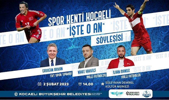 Kocaeli’nin spor kenti olması için yatırımlarına aralıksız olarak devam eden Büyükşehir, bir yandan da Kocaelili sporseverleri yıldız isimlerle bir araya getiriyor. 2 Şubat Perşembe günü SDKM’de saat 14.00’te başlayacak ‘‘İşte O An’’ söyleyişinde Türk futbolunun milli yıldızları Nihat Kahveci ve İlhan Mansız, tanınmış spor spikeri Erdoğan Arıkan’ın moderatörlüğünde yaşadıkları ‘’o anları’’ anlatacak.