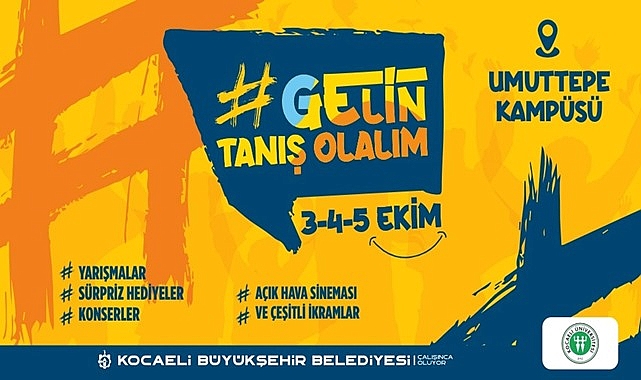 Kocaeli Büyükşehir Belediyesi’nin Gelin Tanış Olalım etkinliği Kocaeli Üniversitesi Umuttepe Kampüsü’nde 3 gün boyunca 10.00-20.00 saatleri arasında gerçekleştirilecek. Programda, öğrencilere çekilişle çeşitli hediyeler verilirken eğlenceli oyunlar, ikramlar, açık hava sineması ve konser yer alacak. Sosyal medya tanıtımları, Genç Mekân tanıtımları ve Büyükşehir Belediyesi’nin çalışmaları hakkında bilgilendirildiği etkinlikte üniversite gençliği üç gün boyunca hem güzel vakit geçirecek hem de sosyalleşme imkanı bulacak.