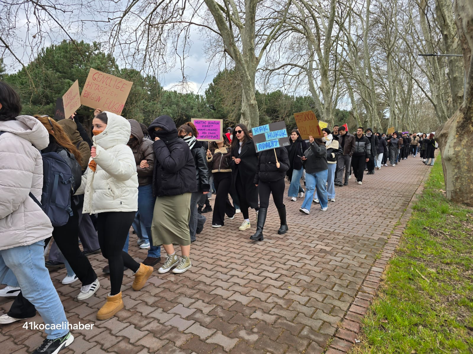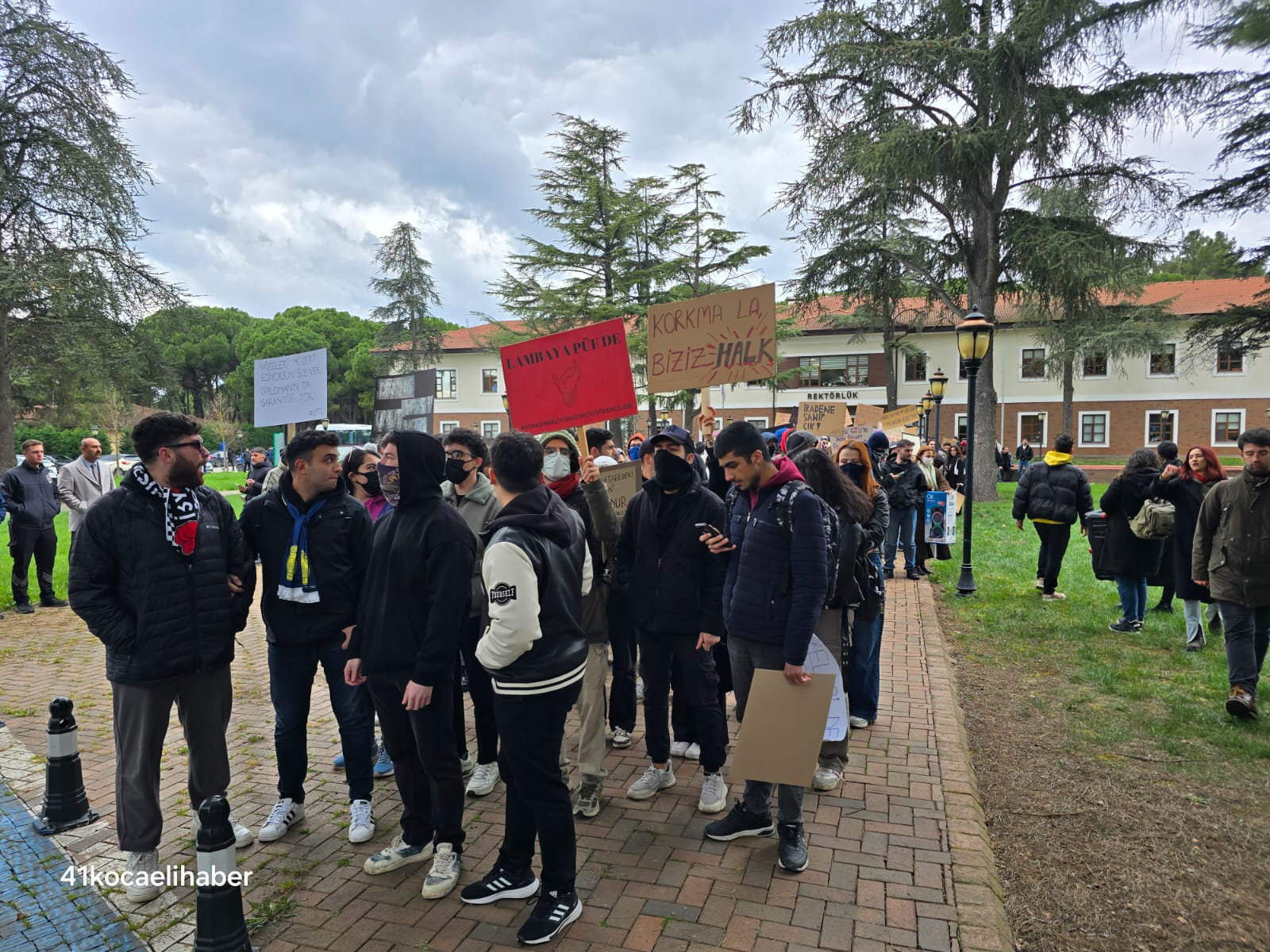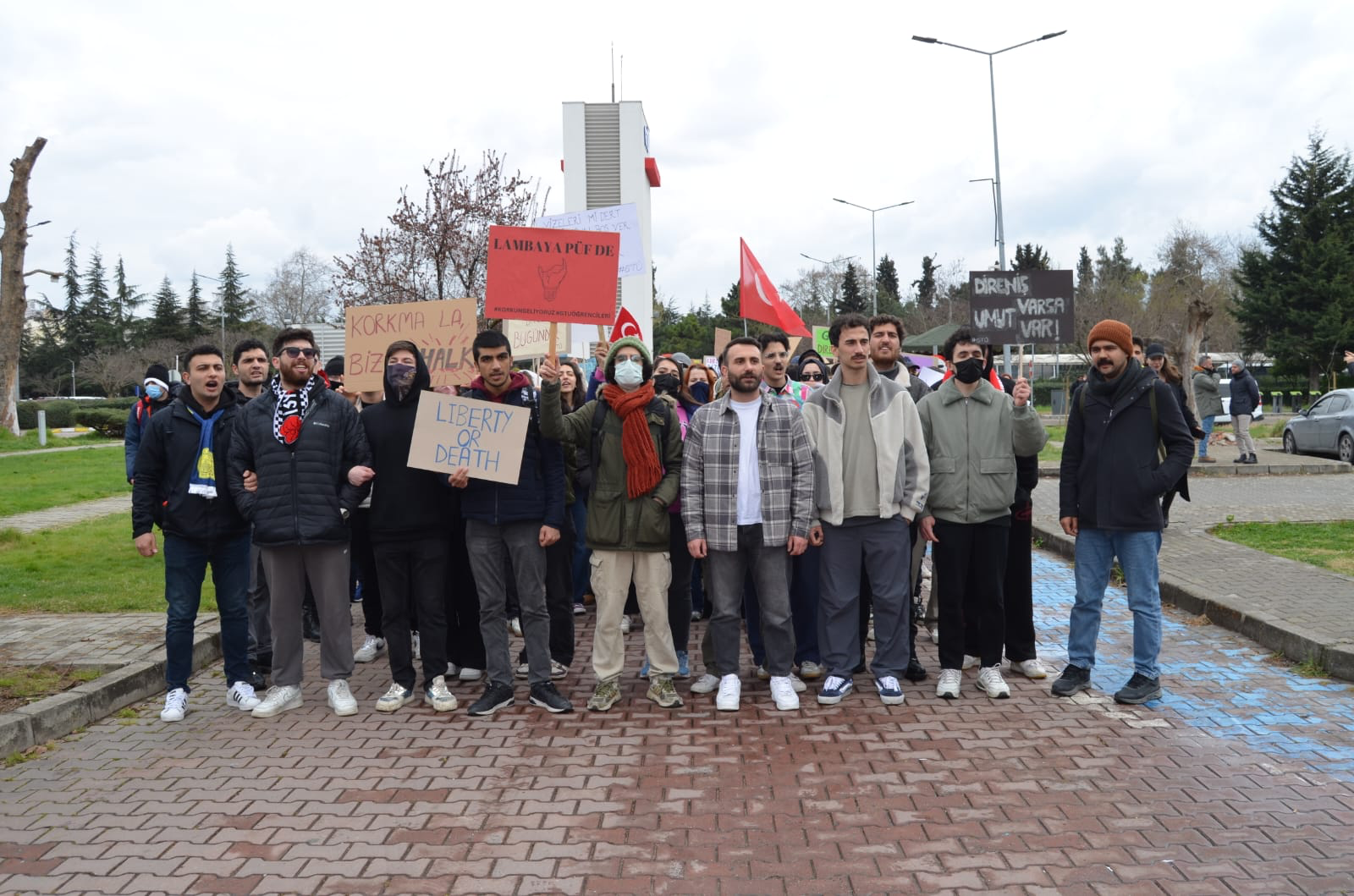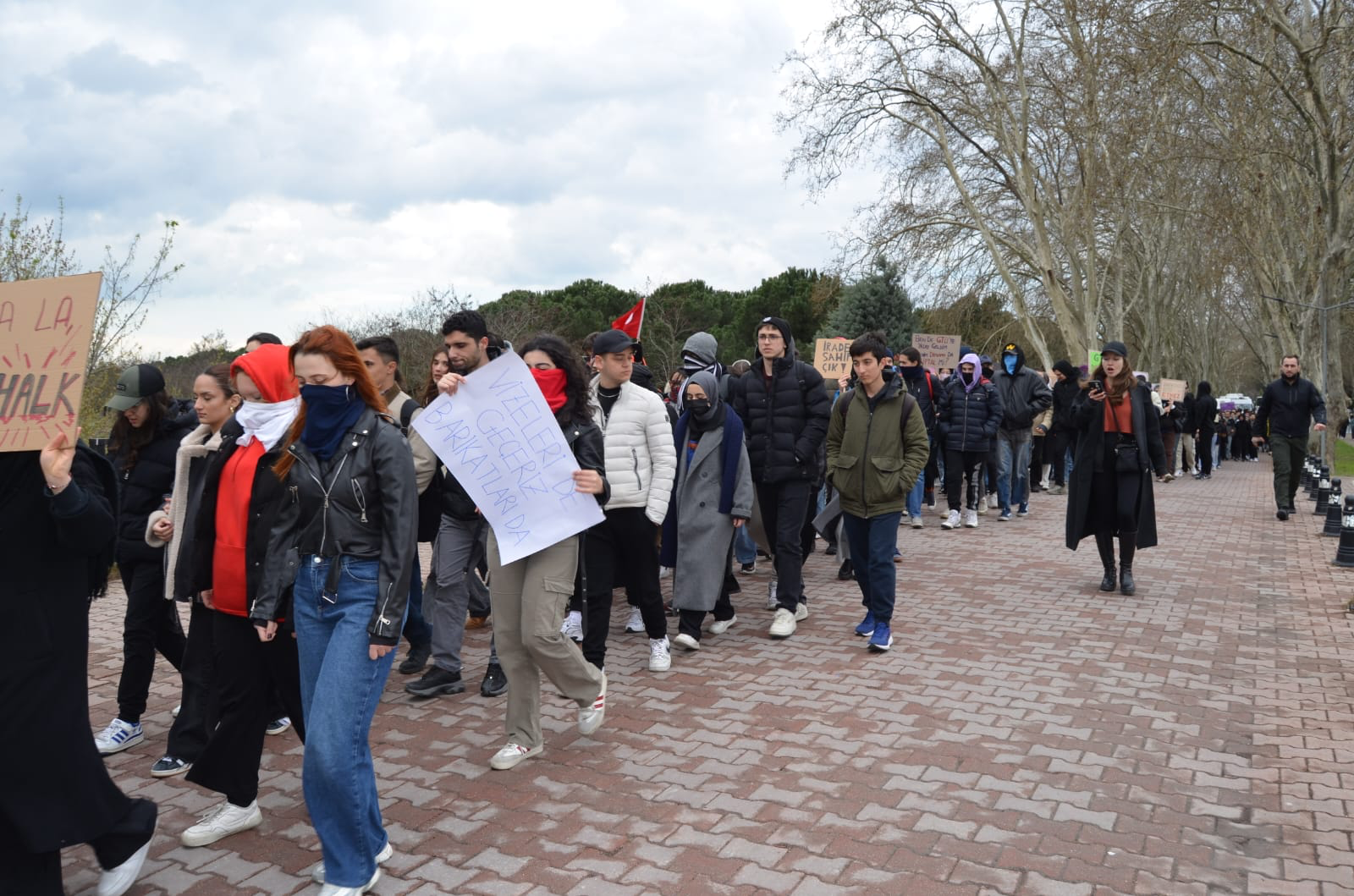 Rektörlük önünde toplanan öğrenciler, ana kapıya kadar sloganlarla yürüdü. yürüyüş sonunda yapılan basın açıklamasında, "Basına, kamuoyuna ve sıra arkadaşlarımıza...