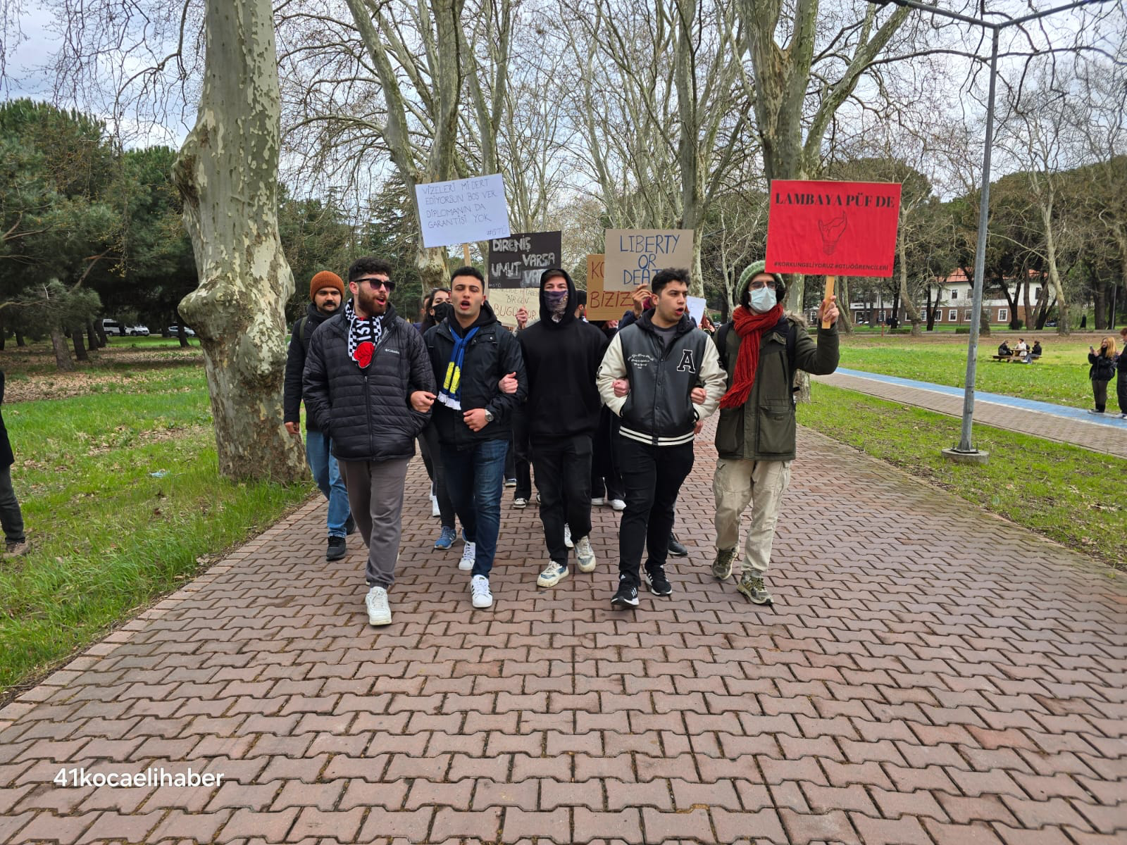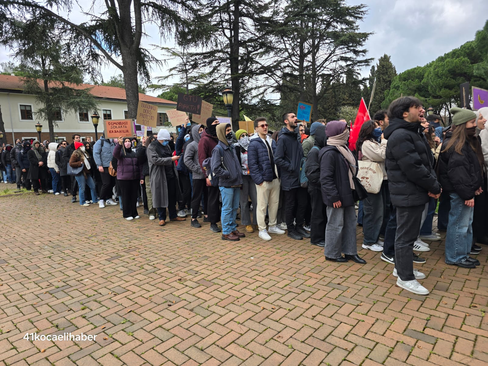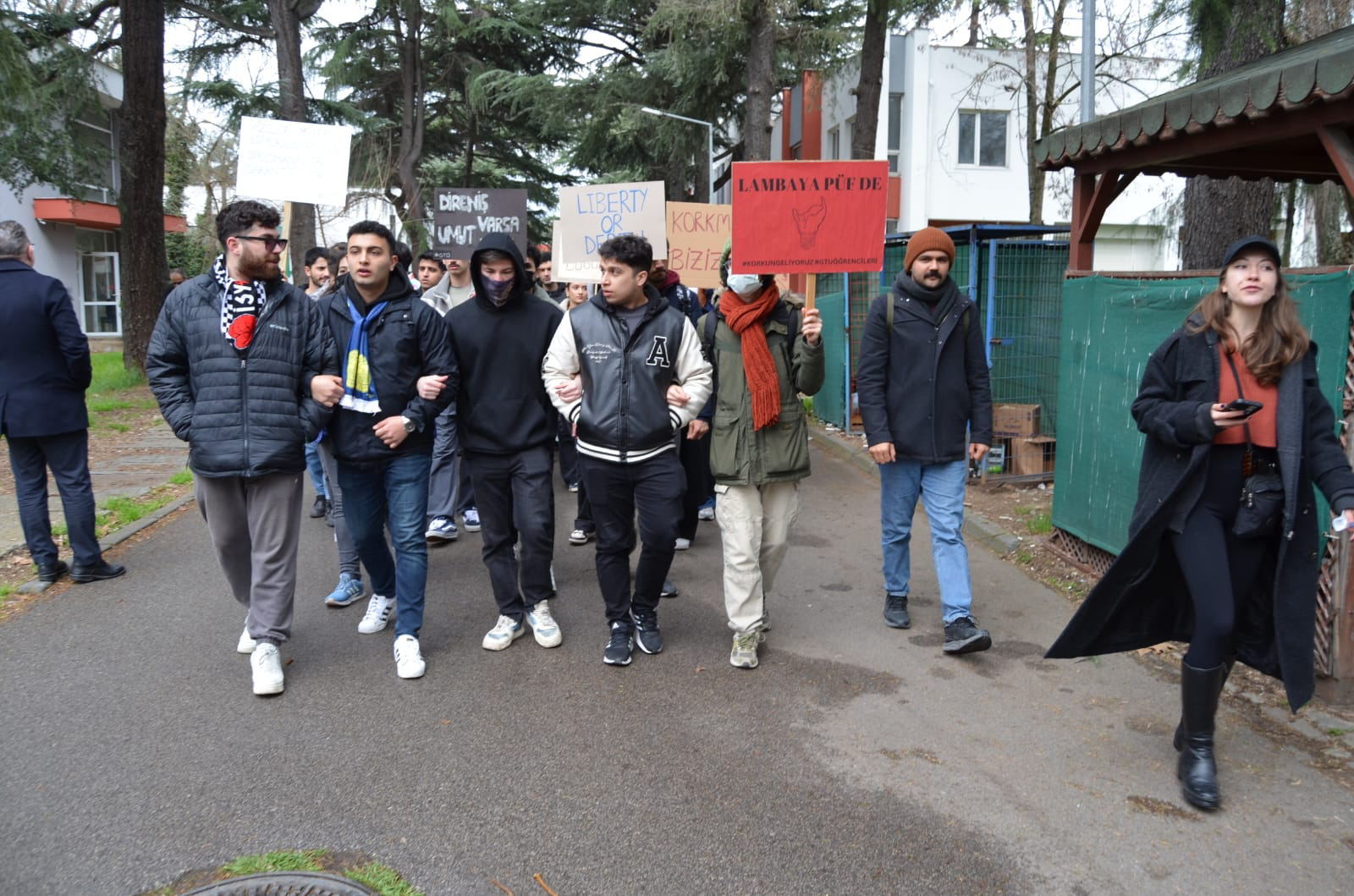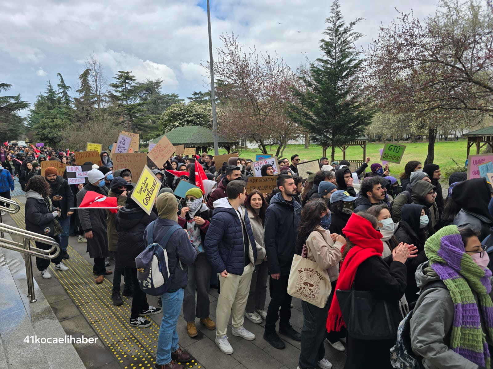 Rektörlük önünde toplanan öğrenciler, ana kapıya kadar sloganlarla yürüdü. yürüyüş sonunda yapılan basın açıklamasında, "Basına, kamuoyuna ve sıra arkadaşlarımıza...