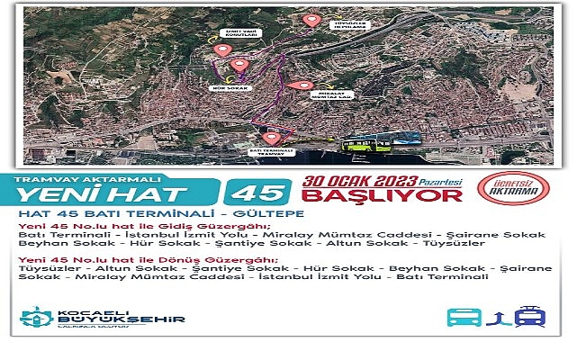 Kocaeli Büyükşehir Belediyesi, vatandaşların ulaşım imkanlarından daha rahat yararlanabilmesi için yeni düzenlemeler yapıyor. Bu kapsamda vatandaşların talebi üzerine Ulaşım Dairesi Başkanlığı Toplu Taşıma Şube Müdürlüğünce kurulan ve Batı Terminali ile Gültepe arasında hizmet verecek hat 45 pazartesi günü seferlerine başlıyor. HAT 45Pazartesi günü seferlerine başlayacak Hat 45’in güzergahları şöyle; Gidiş GüzergahıBatı Terminali – İstanbul İzmit Yolu – Miralay Mümtaz Caddesi – Şairane Sokak – Beyhan Sokak – Hür Sokak - Şantiye Sokak – Altun Sokak – Tüysüzler Dönüş GüzergahıTüysüzler - Altun Sokak - Şantiye Sokak - Hür Sokak - Beyhan Sokak – Şairane Sokak -– Miralay Mümtaz Caddesiİstanbul İzmit Yolu - Batı Terminali