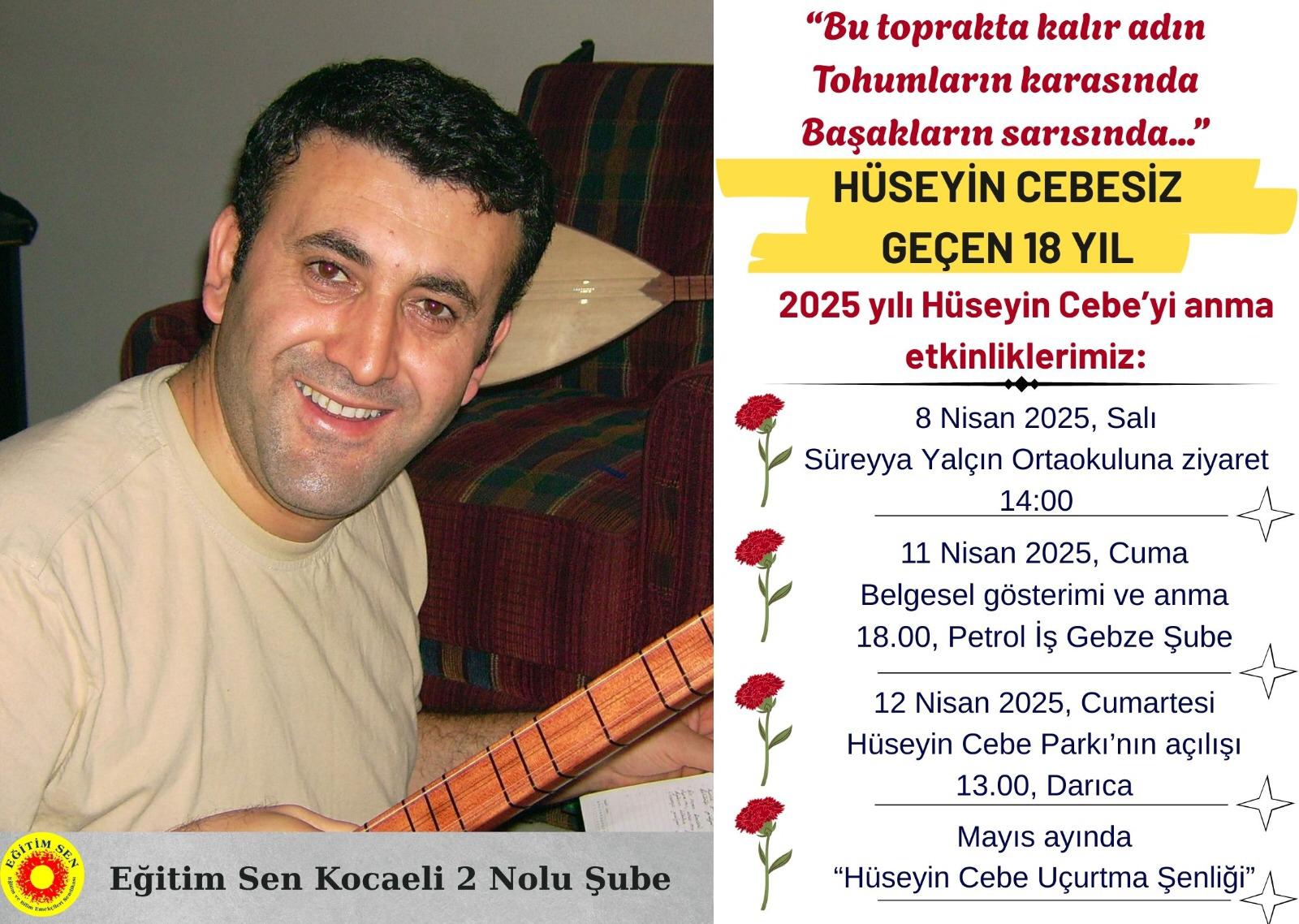Kocaeli'nin Darıca ilçesi Süreyya Yalçın İlköğretim Okulunda görevli iken 2 Nisan 2007 tarihinde sonradan akli dengesi yerinde olmadığı ileri sürülen öğretmen Necati Kumaş tarafından öğrencilerin gözleri önünde öldürülen eğitim emekçisi Hüseyin Cebe, Eğitim Sen Kocaeli 2 No'lu Şubenin düzenleyeceği çeşitli etkinliklerle anılacak. Okul ziyareti, belgesel gösterimi, park açılışı, uçurtma şenliği...Bu yıl anma programı 8 Nisan Salı günü saat 14.00'da Darıca Süreyya Yalçın Ortaokulu'na yapılan ziyaret ile başlayacak. 11 Nisan Cuma günü saat 18.00'de Hüseyin Cebe'nin hayatının anlatıldığı belgeselin ilk gösterimi Petrol-İş Gebze Şubesi'nde izlenecek. 12 Nisan Cumartesi günü ise saat 13.00'te Darıca'da bulunan Hüseyin Cebe Parkının açılışı gerçekleştirilecek. Öte yandan Mayıs ayı içerisinde "Hüseyin Cebe Uçurtma Şenliği" düzenlenecek.