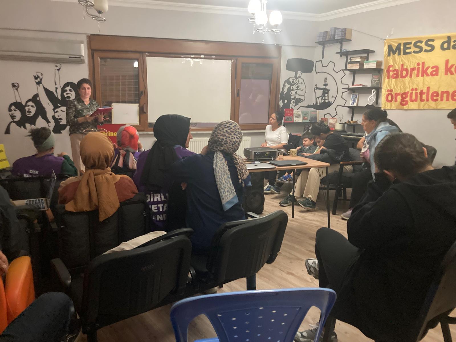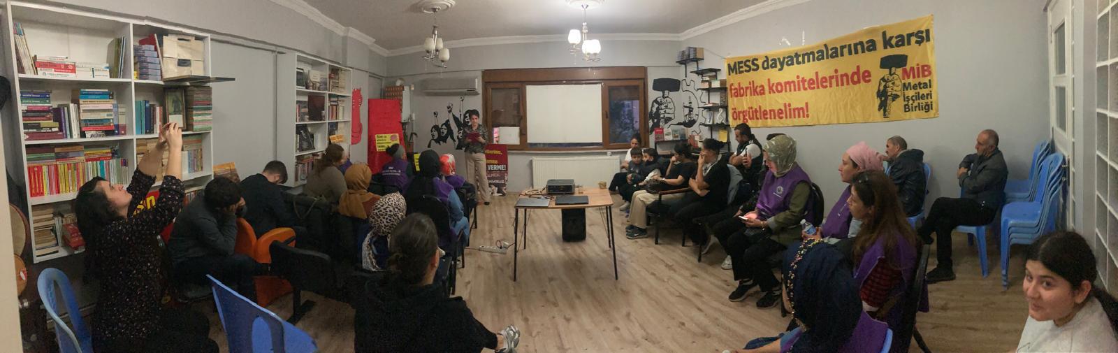 Etkinlikte açılışın ardından sinevizyon gösterimi gerçekleşti. Baskı, şiddet ve sömürü düzenine karşı direnişe ve örgütlenmeye çağıran İEKK Temsilcisi Elif Alçınkaya konuşmasında, Dilovası’ndaki iş cinayetinden, kadın cinayetinde katledilen eski Migros direnişçisi Gülhan’ın katilinin ağırlaştırılmış müebbet aldığı dava sürecinden ve kadın işçilerin en önde olduğu Smart Solar başta olmak üzere güç alınan direnişlerden bahsedildi.
