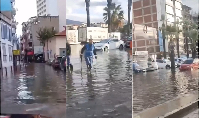 İzmir'de gece saatlerine etkili olan yoğun yağışın ardından denizin taşması sonucu yollar, iş yerleri ve araçlar su altında kaldı.