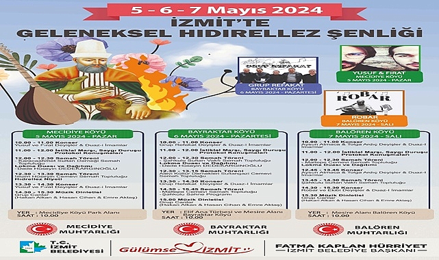 İzmit Belediyesi Kültür ve Sosyal İşler Müdürlüğü bünyesinde bu yıl da baharın müjdecisi Hıdırellez büyük bir coşkuyla kutlanacak. 5-6-7 Mayıs tarihlerinde İzmit’in farklı noktalarında düzenlenecek olan Hıdırellez programları, baharın gelişini coşkuyla karşılayacak olan herkesi bir araya getirecek. 3 GÜN SÜRECEKHıdırellez kutlamaları 5 Mayıs Pazar Günü Mecidiye Köyü’nde start verecek. 6 Mayıs Pazartesi günü Bayraktar Köyü ve 7 Mayıs Salı günü Balören Köyü’nde düzenlenecek olan kutlamalar kapsamında; Semah törenleri, konserler ve müzik dinletileri olacak. KÖYLERE ULAŞIM DESTEĞİİzmit Belediyesi, kutlama alanlarına ulaşım kolaylığı sağlamak amacıyla İzmit Kuryapı önünden ve Derince Cemevi önünden saat 09:00 itibarıyla araç kaldıracak. Katılımcılar, program süresince ücretsiz ulaşım hizmetinden yararlanabilecek.ETKİNLİKLER VE İKRAMLARProgram boyunca çocuklar için animasyon ekipleri ve çeşitli eğlenceler düzenlenecek. İkramların da yer alacağı program kapsamında Hıdırellez’in bolluk ve bereket getirmesi amacıyla geleneksel olarak düzenlenen lokma duası ve dağıtımı yapılacak. KÜLTÜREL DEĞERLER YAŞATILIYORİzmit Belediyesi tarafından düzenlenen bu etkinlikler, yerel halkın kültürel değerlerini yaşatmayı ve yeni nesillere aktarmayı amaçlıyor. Belediye yetkilileri, bu tür etkinliklerle hem toplumun kültürel zenginliğini koruyup geliştirmeyi hem de her yaş grubundan insanı doğayla ve birbirleriyle vakit geçirmeye teşvik etmeyi hedefliyor.