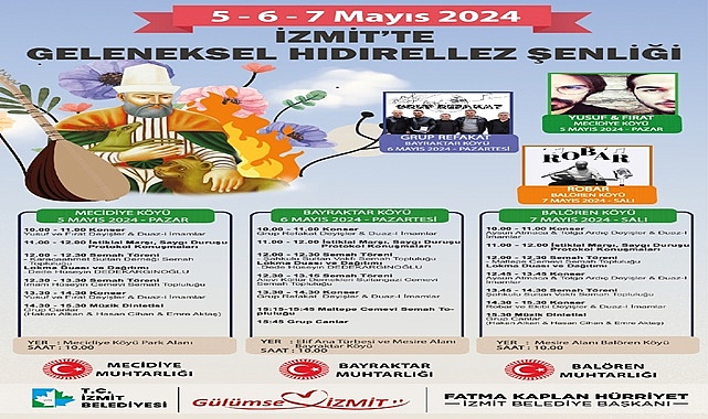İzmit Belediyesi Kültür ve Sosyal İşler Müdürlüğü bünyesinde bu yıl da baharın müjdecisi Hıdırellez büyük bir coşkuyla kutlanacak. 5-6-7 Mayıs tarihlerinde İzmit’in farklı noktalarında düzenlenecek olan Hıdırellez programları, baharın gelişini coşkuyla karşılayacak olan herkesi bir araya getirecek. Programlarda Halk Dansları ve birbirinden eğlenceli etkinlikler İzmitlileri bekliyor. YARININ PROGRAMI10.00 - Mecidiye Köyü 17.00 - Yahya Kaptan Mahallesi Hanımeli Kültür Merkezi Hıdırellez Ateşi18.00 - Geleneksel Kertil Tekke Hıdırellez Konserleri PROGRAMLAR 3 GÜN SÜRECEKHıdırellez kutlamaları 5 Mayıs Pazar Günü (Yarın) Mecidiye Köyü’nde başlayacak. 6 Mayıs Pazartesi günü Bayraktar Köyü ve 7 Mayıs Salı günü Balören Köyü’nde düzenlenecek olan kutlamalar kapsamında; Semah törenleri, konserler ve müzik dinletileri olacak. KÖYLERE ULAŞIM DESTEĞİ SAĞLANACAK İzmit Belediyesi, kutlama alanlarına ulaşım kolaylığı sağlamak amacıyla İzmit Kuryapı önünden ve Derince Cemevi önünden saat 09:00 itibarıyla araç kaldıracak. Katılımcılar, program süresince ücretsiz ulaşım hizmetinden yararlanabilecek. ETKİNLİKLER VE İKRAMLARDA BULUNULACAKProgram boyunca çocuklar için animasyon ekipleri ve çeşitli eğlenceler düzenlenecek. İkramların da yer alacağı program kapsamında Hıdırellez’in bolluk ve bereket getirmesi amacıyla geleneksel olarak düzenlenen lokma duası ve dağıtımı yapılacak. DEĞERLER YENİ NESİLLERE AKTARILACAKİzmit Belediyesi tarafından düzenlenen bu etkinlikler, yerel halkın kültürel değerlerini yaşatmayı ve yeni nesillere aktarmayı amaçlıyor. Belediye yetkilileri, bu tür etkinliklerle hem toplumun kültürel zenginliğini koruyup geliştirmeyi hem de her yaş grubundan insanı doğayla ve birbirleriyle vakit geçirmeye teşvik etmeyi hedefliyor.