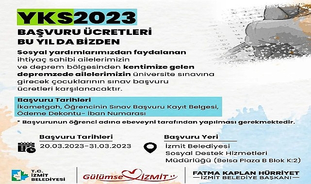 Eğitimde fırsat eşitsizliğini ortadan kaldırmak adına sosyal belediyecilik örneklerini sergilemeye devam eden İzmit Belediyesi, ailelerin Eğitim giderlerine Destek olmak amacıyla YKS sınavına girecek olan ihtiyaç sahibi öğrencilerin sınav ücretlerini karşılayacak. Her sene yapılan bu uygulamadan bu sene deprem felaketi sebebiyle kentimize göç eden depremzede ailelerin üniversite çağındaki çocukları da faydalanabilecek. BAŞVURULAR YÜZ YÜZE GERÇEKLEŞECEKİzmit Belediyesi Sosyal Destek Hizmetleri Müdürlüğü bünyesinde yapılan bu uygulama ile ihtiyaç sahibi ailelerin eğitim giderlerine destek olmak ve depremzede ailelerin kente uyum sürecini kolaylaştırmayı amaçlıyor. Başvurular Sosyal Destek Hizmetleri Müdürlüğü’nde (Belsa Plaza B Blok 2. Kat) yüz yüze gerçekleştirilecek. Başvuru sahibinin İzmit Belediyesi Sosyal Destek Hizmetleri Müdürlüğü’nün sosyal yardımlarından düzenli şekilde faydalanıyor olması gerekiyor. BAŞVURUDA İSTENECEK BELGELER -Öğrencinin Sınav Başvuru Kayıt Belgesi -İkametgah Belgesi -Ödeme Dekontu -İban Numarası (Öğrencinin anne, baba ya da vasisine ait olmalıdır.)