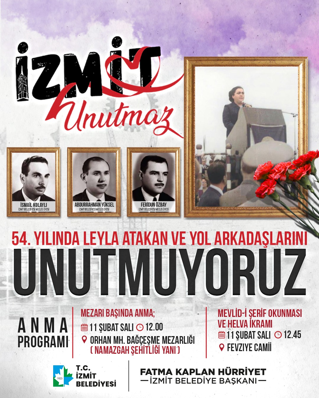 Türkiye'nin tek dereceli seçim sistemiyle ilk kadın belediye başkanı olan Leyla Atakan, 54. ölüm yıldönümünde İzmit Belediyesi tarafından düzenlenen programla düzenlenecek. Leyla Atakan için düzenlenecek anma programı 11 Şubat 2024 Salı günü saat 12.00'de Orhan Mahallesi Bağçeşme Mezarlığı'nda gerçekleştirilecek. Ardından Fevziye Camii'nde saat 13.00'de Mevlid-i Şerif okunarak helva ikramında bulunulacak.
