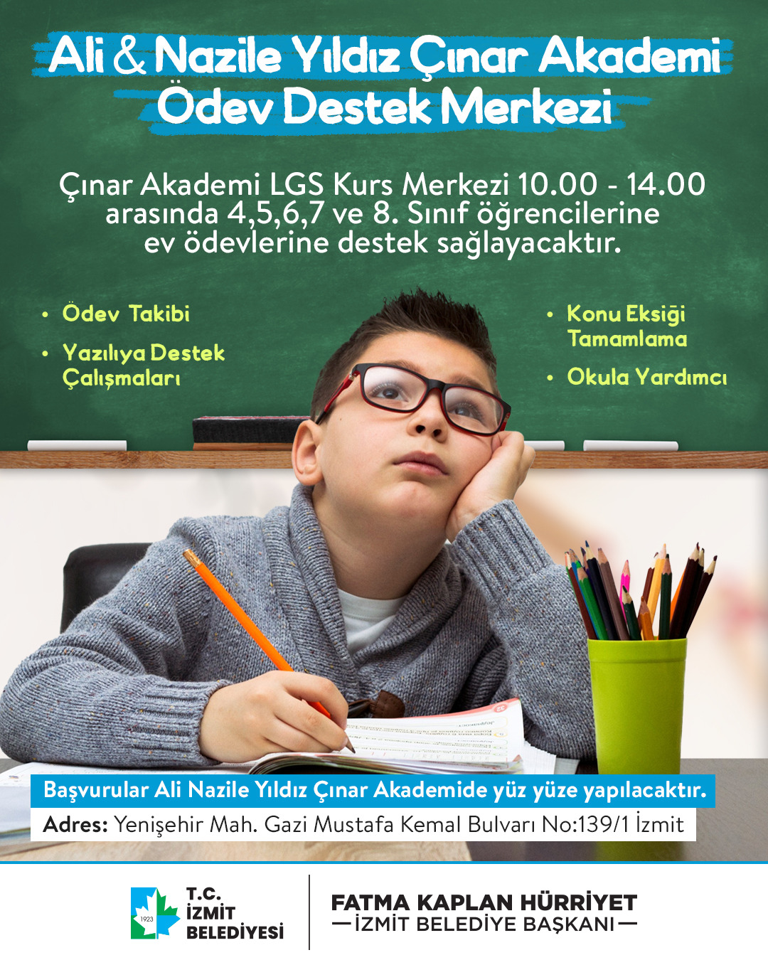 Hafta içi 10.00 - 14.00 saatleri arasında hizmet verecek olan merkez için başvurular yüz yüze yapılacaktır. Eğitim desteğinden yararlanmak isteyen, Yenişehir Mahallesi, Gazi Mustafa Kemal Bulvarı No:139/1 konumunda bulunan Çınar Akademi LGS Kurs Merkezi'ne başvurabilir.