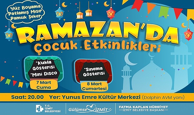 Ramazan ayının manevi atmosferini kültürel ve eğlenceli etkinliklerle destekleyen İzmit Belediyesi, çocukların bu özel dönemi neşe içinde geçirmesi için her hafta farklı etkinlikler sunacak. Etkinlikler ilk olarak 7 Mart Cuma günü 20.00’de kukla gösterisi ile mini disco ve 8 Mart Cumartesi günü sinema etkinliği ile başlayacak. İzmit Belediyesi ücretsiz olarak gerçekleştirilecek etkinliklere tüm çocukları ve ailelerini davet ediyor.