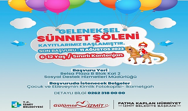 6-12 yaş arası çocukların kabul edileceği etkinliğin ikinci başvuru kayıtları 11 Ağustos 2023 tarihine kadar devam edecek. Yapılan değerlendirmenin ardından başvurusu kabul edilen aileler çocuklarını anlaşmalı hastanelerde sünnet ettirebilecek. Operasyonların tamamlanmasının ardından çocuklar için büyük bir sünnet şöleni düzenlenecek, çocuklar eğlenceye doyacak. İzmit Belediyesi; sünnet kıyafetleri, fotoğraf çekimleri, sünnet konvoyu ve ikramlarla çocuklara güzel bir anı bırakacak.