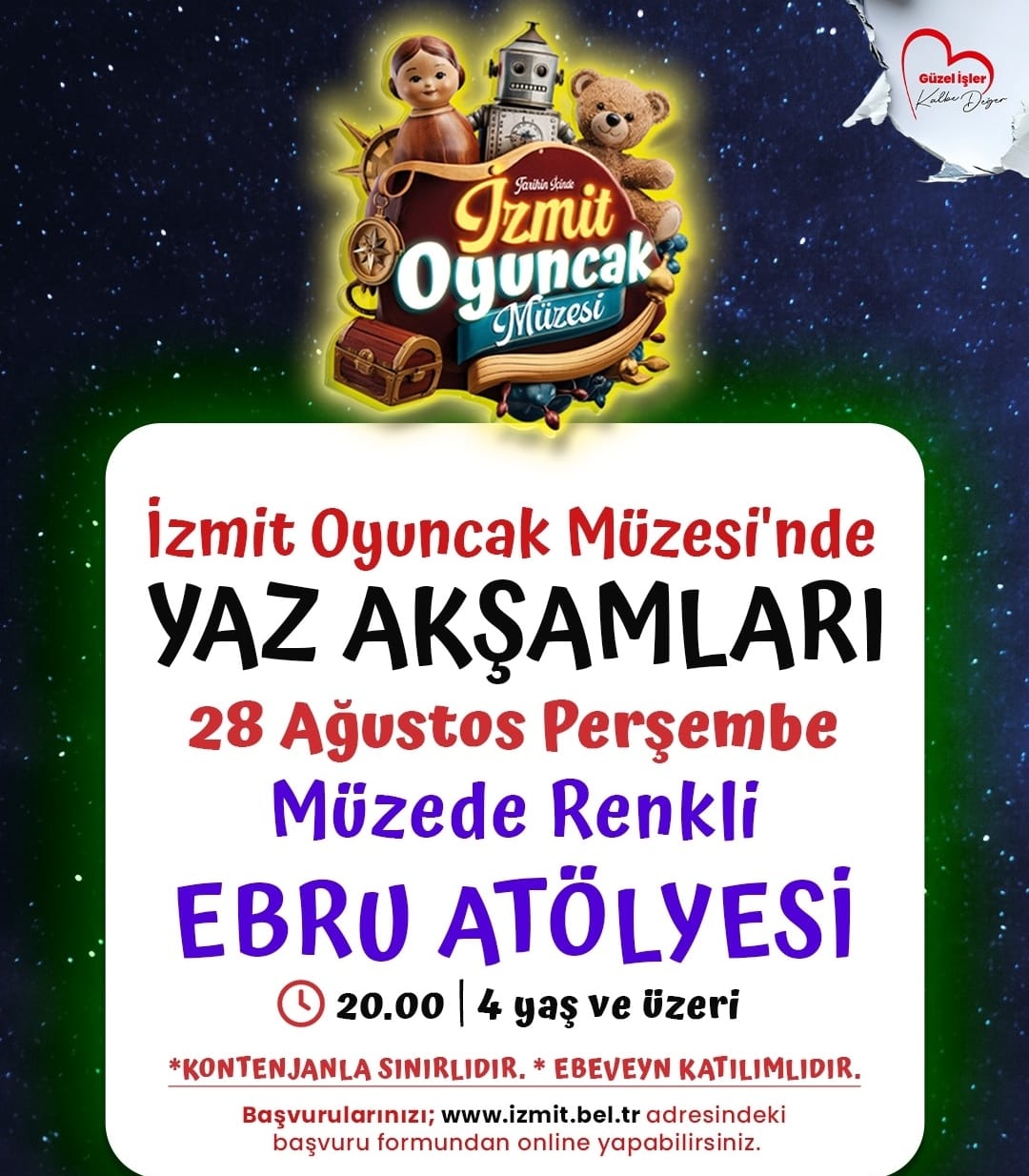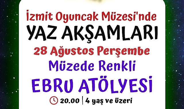 İzmit Belediyesi tarafından Tarihi Kapanca Sokak’ta bulunan Oyuncak Müzesi bahçesinde düzenlenen “Müzede Yaz Akşamları Atölyeleri” perşembe akşamları vatandaşlarla buluşmaya devam ediyor. Etkinlik kapsamında 28 Ağustos Perşembe günü saat 20.00’de 4 yaş ve üzeri çocuklara yönelik “Ebeveyn Katılımlı Müzede Renkli Ebru Atölyesi” gerçekleştirilecek. Atölyede artık kumaş ve tüllerden yapılmış kuyruklar, hoparlör, ebru teknesi, akrilik boya, pipet, plastik kaplar ve karton bardaklar kullanılacak. ÇALIŞMALAR YAPILACAKProgram, çember düzeninde tanışma ve ısınma oyunlarıyla başlayacak. Ardından çocuklar, iki gruba ayrılarak su oyunları oynayacak. Oyunların ardından sanat bölümüne geçilecek ve her çocuk ebeveyniyle birlikte A4 kâğıtlar üzerine ebru çalışması yapacak. Açık havada gerçekleşecek atölyede çocuklar, drama ve su oyunları sayesinde bedensel koordinasyonlarını, hayal gücü ve rol yapma becerilerini geliştirme fırsatı bulacak. Grup halinde oynanan etkinlikler ise işbirliği, iletişim ve sosyal uyum becerilerini destekleyecek.