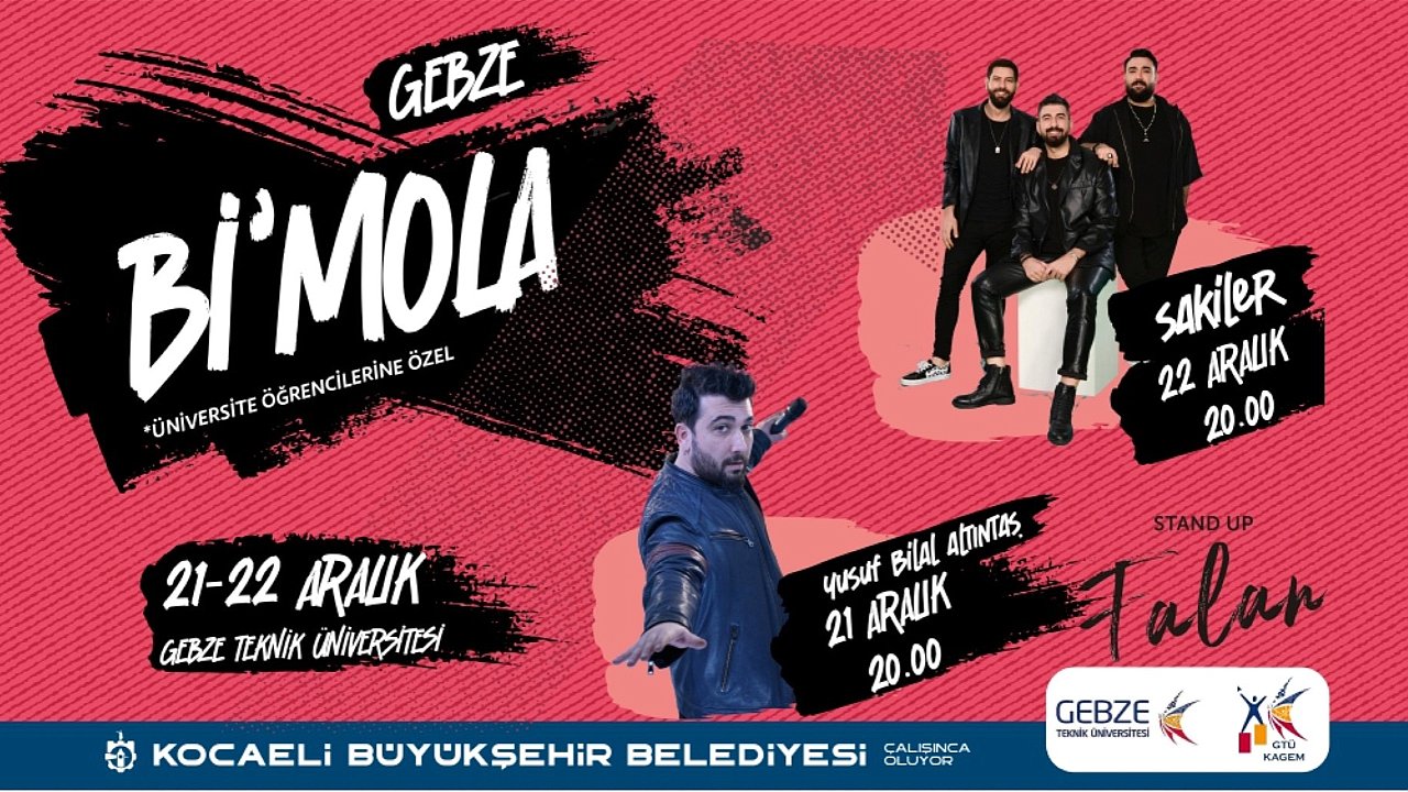 Kocaeli Büyükşehir Belediyesi bünyesinde bulunan Akademi Üniversite birimi, kocaeli Üniversitesi’nden sonra gebze Teknik Üniversitesi’nde eğitim gören öğrencilere yönelik etkinlik düzenlemeye devam ediyor. Akademik çalışmaların yanı sıra öğrencilere sosyal, kültürel, sanatsal alanda da birçok imkân sunan Akademi Üniversite biriminin “Kampüste Bi’Mola” etkinlik programının birinci günü Yusuf Bilal Altıntaş stand-up gösterisi yaparken ikinci gün ise sevilen grup Sakiler konser verecek.