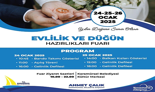 Karamürsel Belediyesi, 24-26 Ocak tarihleri arasında düzenlenecek olan Evlilik ve Düğün Hazırlıkları Fuarı’na tüm vatandaşları davet ediyor. Fuarın açılışını yapacak olan Belediye Başkanı Ahmet Çalık, yaptığı açıklamada, fuarın evlilik hazırlığı yapan çiftlere büyük bir kolaylık sağlayacağını belirterek, “Bu fuar, sadece gelinlik ve damatlık değil, düğün organizasyonundan fotoğrafçılığa, mekanlardan catering hizmetlerine kadar tüm detayları bir arada bulabileceğiniz büyük bir etkinlik. Çiftlerimiz, burada ihtiyaç duydukları her türlü bilgiye ulaşabilecek, hayal ettikleri düğün için gerekli tüm adımları atabilecekler. Hep birlikte bu özel günü hazırlamanın heyecanını yaşayacağız. Çiftlerimizin bu önemli günlerinde yanlarında olabilmek, onlara faydalı olabilmek bizim için büyük bir mutluluk. Fuarımıza tüm halkımızı bekliyoruz” dedi.