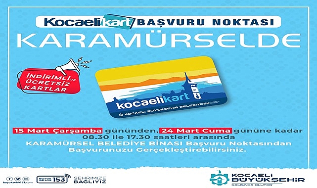 Kocaeli Büyükşehir Belediyesi, seyahat kartları birimindeki artan taleplerin karşılanması için yerinde hizmet veriyor. Bu kapsamda Karamürsel’deki vatandaşlar için geçici büro 15 Mart Çarşamba günü (yarın) kuruluyor.