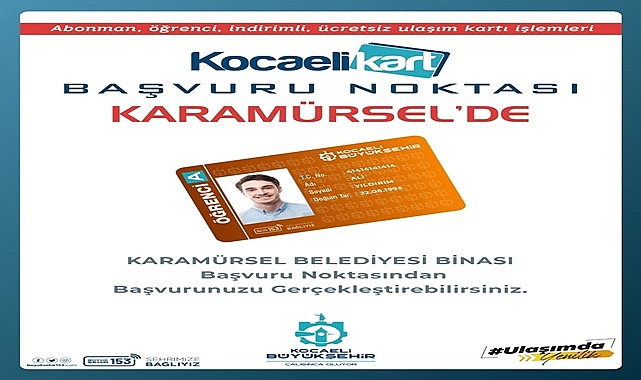 Ulaşım Dairesi Başkanlığı seyahat kartları birimi vatandaşlardan gelen taleplerin karşılanması ve vatandaşlara kolaylık olması amacıyla geçici seyahat kart ofisi açıyordu. Bu kapsamda Karamürsel Belediyesine kurulan geçici seyahat kartları ofisi 07 Ağustos Pazartesi günü itibariyle kalıcı olarak Karamürsel’de hizmet vermeye başlıyor.