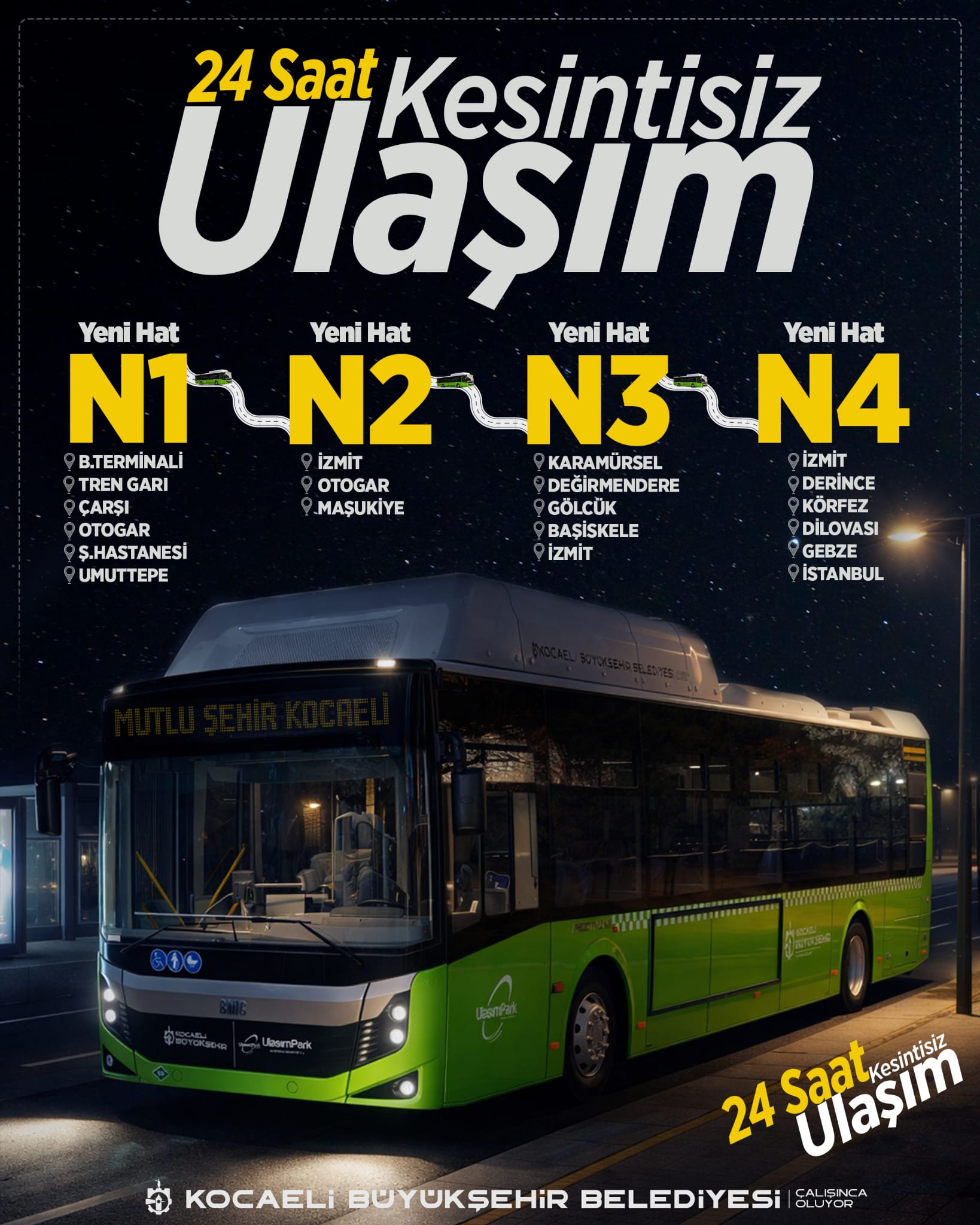 KOCAELİ’DE 24 SAAT KESİNTİSİZ ULAŞIMKocaeli Büyükşehir Belediyesi, kent genelinde ulaşımı daha erişilebilir, konforlu ve sürdürülebilir hale getirmek amacıyla önemli bir adımı daha hayata geçiriyor. Ulaşım Dairesi Başkanlığı’nın titiz çalışmaları sonucunda planlanan 4 yeni gece hattı ile Kocaeli’de 24 saat kesintisiz ulaşım dönemi başlıyor. Vatandaşların ihtiyaçlarına yönelik planlanan N1, N2, N3 ve N4 numaralı hatlar, 09 Şubat 2026 Pazartesi gününü 10 Şubat Salı gününe bağlayan gece itibarıyla hizmete alınacak. Şehrin dört bir yanına gece boyunca ulaşım imkânı sunacak yeni hatlar, vatandaşlar için büyük kolaylık sağlayacak. ŞEHRİN DÖRT BİR YANINA GECE SEFERLERİYeni uygulama kapsamında devreye alınacak hatlar, özellikle gece saatlerinde ulaşım ihtiyacının yoğun olduğu bölgeleri kapsayacak şekilde planlandı. Sanayi bölgeleri, hastaneler, otogar, üniversite yerleşkesi ve ana aktarma merkezlerini birbirine bağlayacak hatlar sayesinde vatandaşlar günün her saatinde güvenli ve konforlu bir şekilde seyahat edebilecek. Kocaeli’de hayata geçirilen bu yeni ulaşım modeliyle birlikte kent geneli ulaşımda önemli bir konfor ve erişim kolaylığı sağlanacak. SEFER SAATLERİ VE GÜZERGÂH BİLGİSİ PAYLAŞILACAK24 saat kesintisiz hizmet verecek N1, N2, N3 ve N4 numaralı yeni hatların sefer saatleri ve güzergâh bilgileri, kocaeli.bel.tr resmi internet sitesi ve E-komobil mobil uygulaması üzerinden vatandaşlarla paylaşılacak. YENİ HATLAR VE GÜZERGAHLARIN1: Batı Terminali-Tren Garı-Çarşı-Otogar-Şehir Hastanesi-UmuttepeN2: İzmit-Otogar-MaşukiyeN:3 Karamürsel-Ulaşlı-Halıdere- Değirmendere-Gölcük-Başiskele- İzmit OtogarN4: İzmit-Otogar-D-100-Derince- Körfez-Dilovası-Gebze-Çayırova
