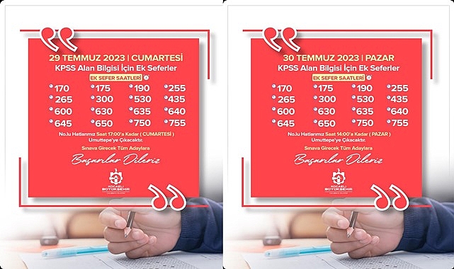 Kocaeli Büyükşehir Belediyesi, 29 Temmuz Cumartesi ve 30 Temmuz Pazar günü yapılacak Kamu Personeli Seçme Sınavı’na (KPSS) girecek adayların ulaşımda sorun yaşamaması için aynı gün ek seferler düzenleyecek. Bu kapsamda 170, 175, 190, 255, 265, 300, 435, 530, 600, 630, 635, 640, 645, 650, 750 ve 755 No’lu hatlar 2 gün ek sefer uygulanacak.