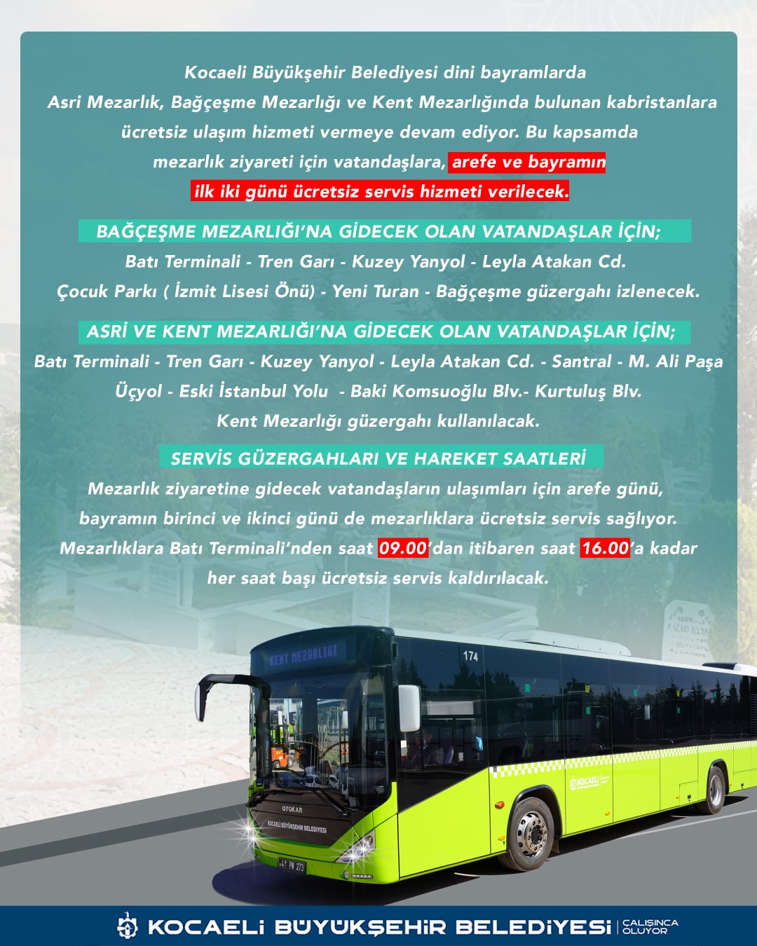 Asri ve Kent Mezarlığı’na gidecek olan vatandaşlar ise Tren Garı-Kuzey Yanyol-Leyla Atakan Caddesi-Santral-M. Ali Paşa-Üçyol -Eski İstanbul Yolu-İzmit Kent-Baki Komsuoğlu Bulvarı ve Kurtuluş Bulvarı güzergâhı üzerinden mezarlıklara ulaşabilecek.