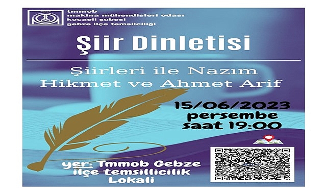 Makine mühendisleri odası Kocaeli Gebze ilçe temsilciliğinin düzenlediği NAZIM HİKMET ve AHMED ARİF' in ölüm yıldönümü münasebetiyle TMMOB'da bir anma programı düzenleniyor.