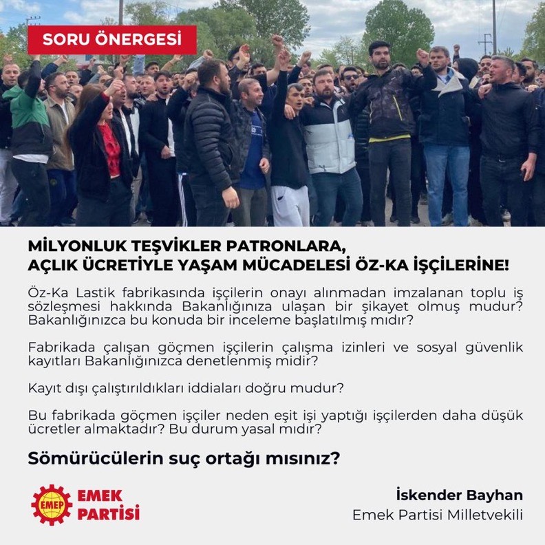 Emek Partisi (EMEP) İstanbul Milletvekili İskender Bayhan, Kocaeli’de kurulu Öz-Ka Lastik fabrikasında yaşanan hak ihlalleri, kayıt dışı istihdam, ücret adaletsizliği ve sendikal hak gasplarıyla ilgili olarak Çalışma ve Sosyal Güvenlik Bakanı Vedat Işıkhan’ın yazılı olarak yanıtlaması istemiyle Türkiye Büyük Millet Meclisine (TBMM) soru önergesi verdi.