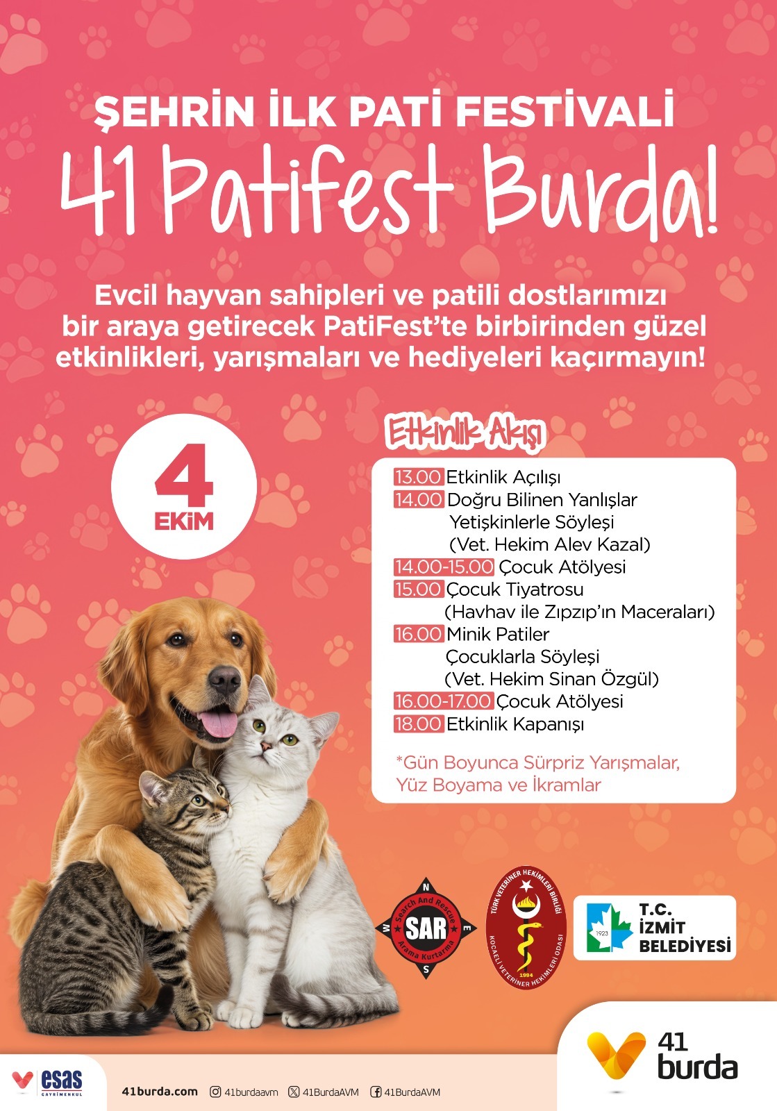 İzmit Belediyesi, 41 Burda AVM, SAR Arama Kurtarma Derneği ve Kocaeli Veteriner Hekimleri Odası iş birliğiyle kentin ilk pati festivali düzenleniyor. Evcil hayvan sahipleri ile patili dostlarını buluşturacak “41 Patifest”, 4 Ekim Dünya Hayvanları Koruma Günü’nde renkli etkinliklerle İzmitlilere keyifli anlar yaşatacak. GÜN BOYU ETKİNLİKLER41 Burda AVM’de gerçekleşecek olan festival kapsamında hem yetişkinler hem de çocuklar için farklı etkinlikler hazırlanıyor. Veteriner hekimlerin bilgilendirici söyleşileri, çocuk tiyatrosu, yaratıcı atölyeler ve sürpriz yarışmalarla dolu bir gün hayvanseverleri bekliyor. Ayrıca festival boyunca yüz boyama, ikramlar ve çeşitli aktivitelerle katılımcılar eğlenceli vakit geçirecek. Festival, herkese açık ve ücretsiz olacak. Etkinlik Programı13.00 – Etkinlik Açılışı14.00 – “Doğru Bilinen Yanlışlar” Yetişkinlerle Söyleşi (Vet. Hekim Alev Kazal)14.00-15.00 – Çocuk Atölyesi15.00 – Çocuk Tiyatrosu: Havhav ile Zıpzıp’ın Maceraları16.00 – “Minik Patiler” Çocuklarla Söyleşi (Vet. Hekim Sinan Özgül)16.00-17.00 – Çocuk Atölyesi18.00 – Etkinlik Kapanışı