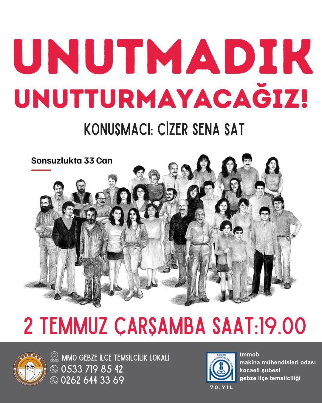 2 Temmuz 1993’te Sivas’ta 33 kişinin yakılarak öldürüldüğü Madımak Katliamı'nın 32. yıl dönümü nedeniyle Gebze MMO ve BİLKAR tarafından ortak bir anma etkinliği gerçekleştirilecek. Sivas’ta hayatını kaybeden 33 insanı anmak ve onları unutturmamak için kurulan hafıza merkezinin illüstratörü, çizer Sena Şat'ın katılacağı etkinlik 2 Temmuz Salı günü saat 19.00'da MMO Gebze’nin ev sahipliğinde, TMMOB Gebze binası (Hacı Halil Mahallesi, Adliye Caddesi, No: 26) lokalinde gerçekleşecek.
