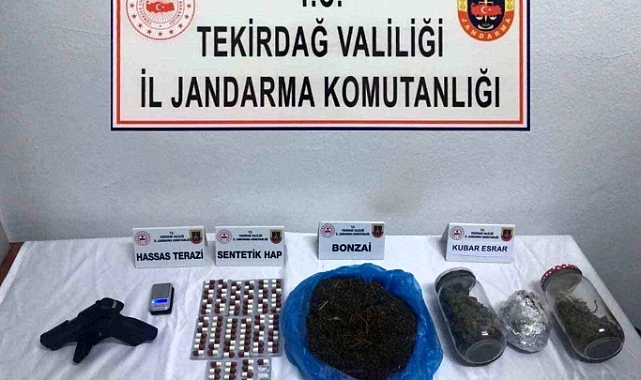 Tekirdağ İl Jandarma Komutanlığınca Süleymanpaşa ilçesi Çiftlikönü Mahallesinde N.D. isimli şahsın evinde yapılan aramada, 103 adet sentetik ecza, 322 gram esrar, 503 gram bonzai, 218 gram skunk, 1 adet tabanca, 1 adet tabanca şarjörü, 11 adet 9 mm fişek, 1 adet hassas terazi ele geçirildi.Süleymanpaşa ilçesi Kumbağ Mahallesinde ise B.Y. isimli şahsın üst aramasında 2.5 gram esrar ele geçirildi.İki şüpheli, gözaltına alındı. (İLKHA)