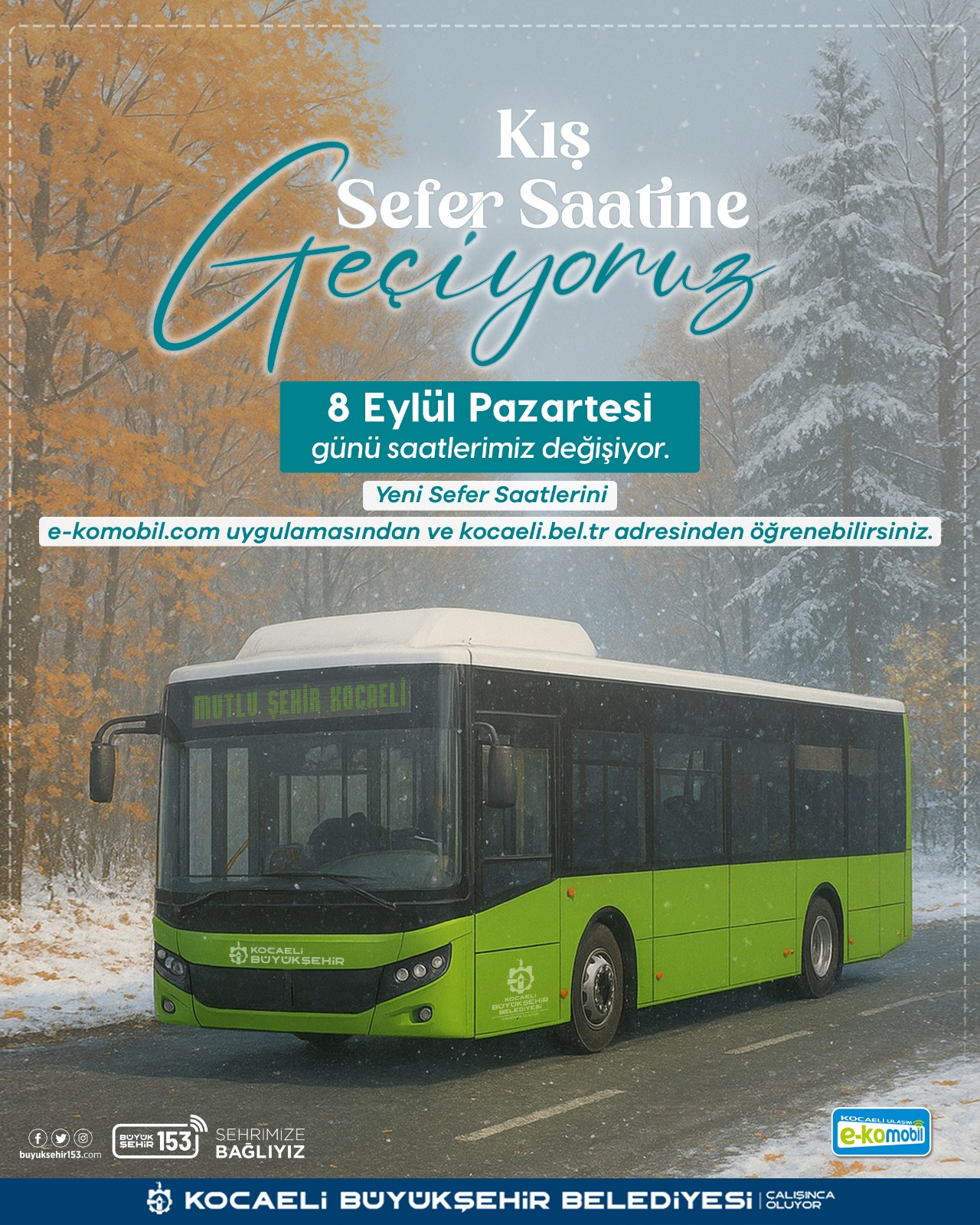 OTOBÜS VE TRAMVAY SAATLERİ DEĞİŞİYORKocaeli Büyükşehir Belediyesi, 2025-2026 eğitim ve öğretim yılının başlamasıyla birlikte 8 Eylül Pazartesi günü (yarın) kış sefer saatlerine geçiyor. Otobüs ve tramvay hatlarının sefer saatleri yeniden düzenlenerek, hem öğrencilerin hem de vatandaşların daha konforlu ve güvenli bir ulaşım hizmeti alması amaçlanıyor. DETAYLI BİLGİ BU ADRESLERDEKocaeli Büyükşehir Belediyesi Ulaşım Dairesi Başkanlığı tarafından yapılan düzenlemelere www.kocaeli.bel.tr/hatlar/ adresinden ve e-Kocaeli mobil uygulamasından ulaşılabiliyor. Web sitesinde ve uygulamada detaylı olarak otobüslerin sefer saatleri, güncel değişiklikler, anlık otobüs ve tramvay takibi bulunuyor.