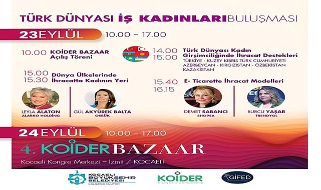 Kocaeli İş Kadınları ve Yöneticileri Derneği (KOİDER) tarafından her yıl geleneksel olarak düzenlenen KOİDER Bazaar etkinliği, 22-24 Eylül 2023 tarihleri arasında Kocaeli Kongre Merkezi’nde gerçekleştirilecek. Etkinlik kapsamında; Türk dünyasının girişimci kadınları, Kocaeli’de bir araya gelecek. Kocaeli Büyükşehir Belediyesi’nin ve Girişimci İş Kadınları Federasyonu’nun (GİFED) desteğiyle yapılan organizasyona, tüm Türkiye’den geniş bir katılım olması bekleniyor. KOİDER Bazaar; Demet Sabancı, Leyla Alaton, Gül Akyürek Balta, Burcu Yaşar gibi ünlü girişimci kadınların katılımına sahne olacak.