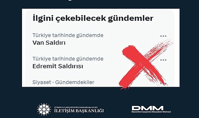 Dezenformasyonla Mücadele Merkezi'nin, resmi X hesabından yapılan açıklamada, "X platformunda bot hesaplar kullanılarak kamuoyunda panik ve infial yaratmak amacıyla, 'Van saldırı' ve 'Edremit saldırısı' etiketleriyle yürütülen manipülatif çalışmalara itibar etmeyiniz." denildi.Açıklamada, "Gündemdekiler (Trends) listesinde görünen bu iki başlıkla ilgili herhangi bir olay veya gelişme söz konusu değildir." ifadesine yer verildi. (İLKHA)